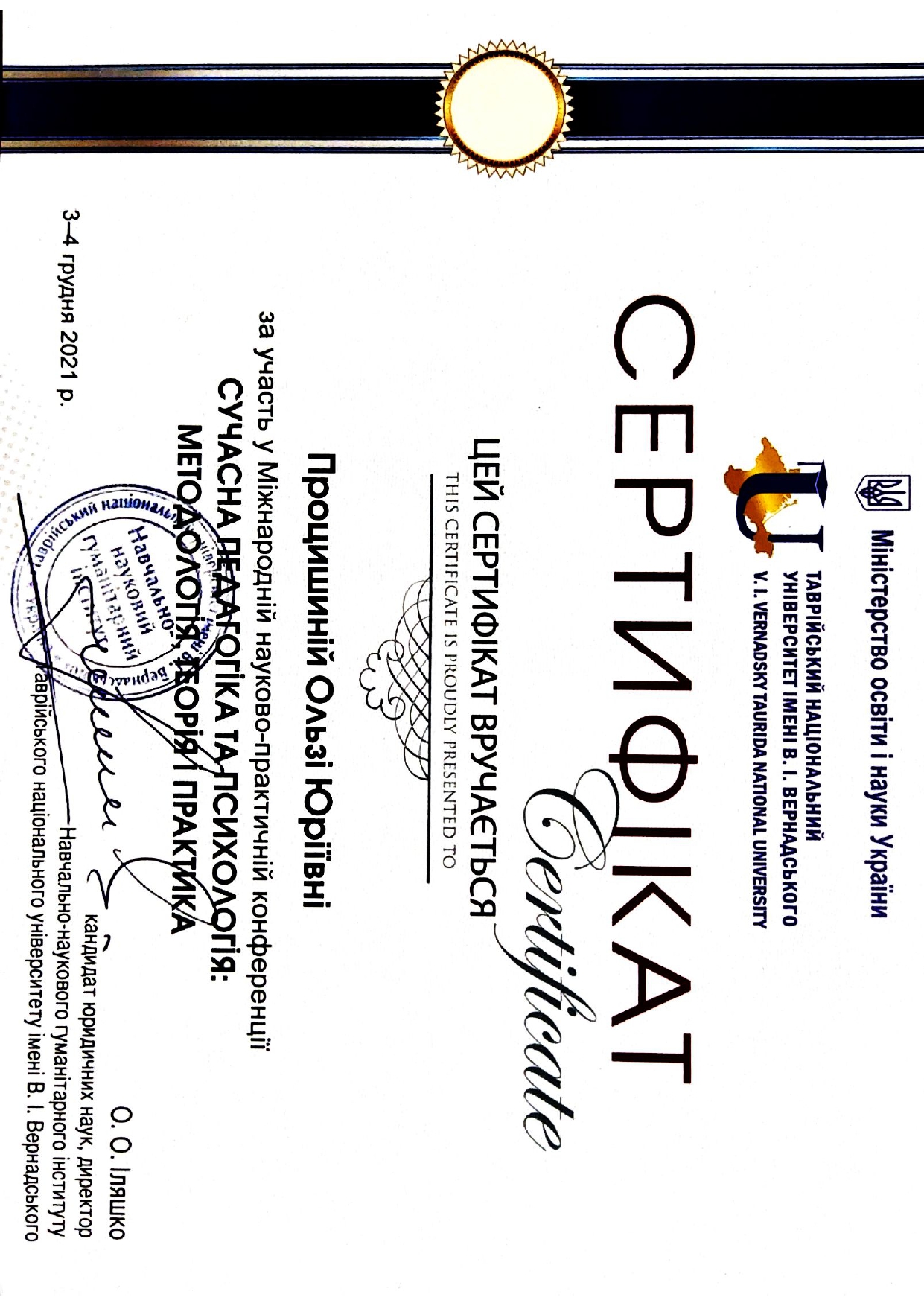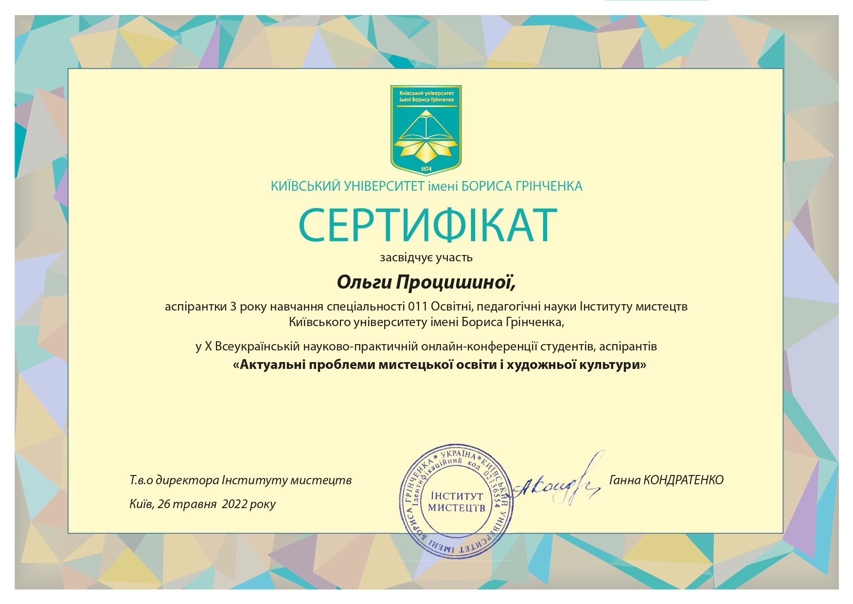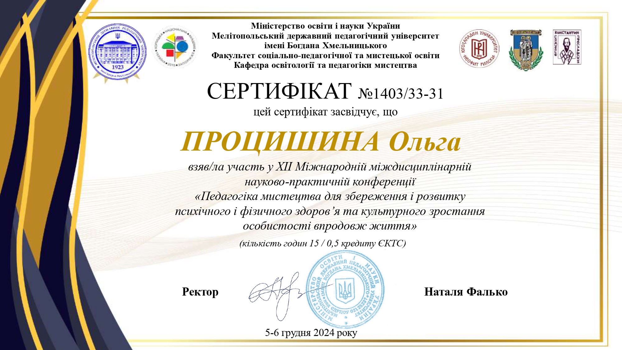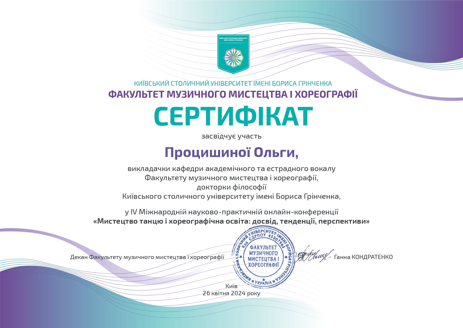 112 Мережко Юлія Валеріївна, доцент кафедри академічного та естрадного вокалу Київського столичного університету імені Бориса Грінченка, кандидат педагогічних наук, доцент. «Формування методичної компетентності майбутніх викладачів мистецької школи на заняттях сольного співу» / спеціальність 011 Освітні, педагогічні науки З вересня 2019 р. і до вересня 2023 р. навчалась в аспірантурі Університету Грінченка на освітньо-науковій програмі «Освітні, педагогічні науки» (спеціальність 011 Освітні, педагогічні науки, галузь знань 01 Освіта/Педагогіка). Київський столичний університет імені Бориса Грінченка Диплом_Процишина.PDF 2024
