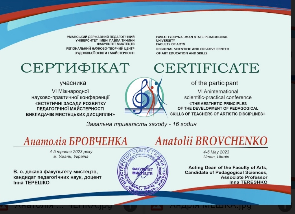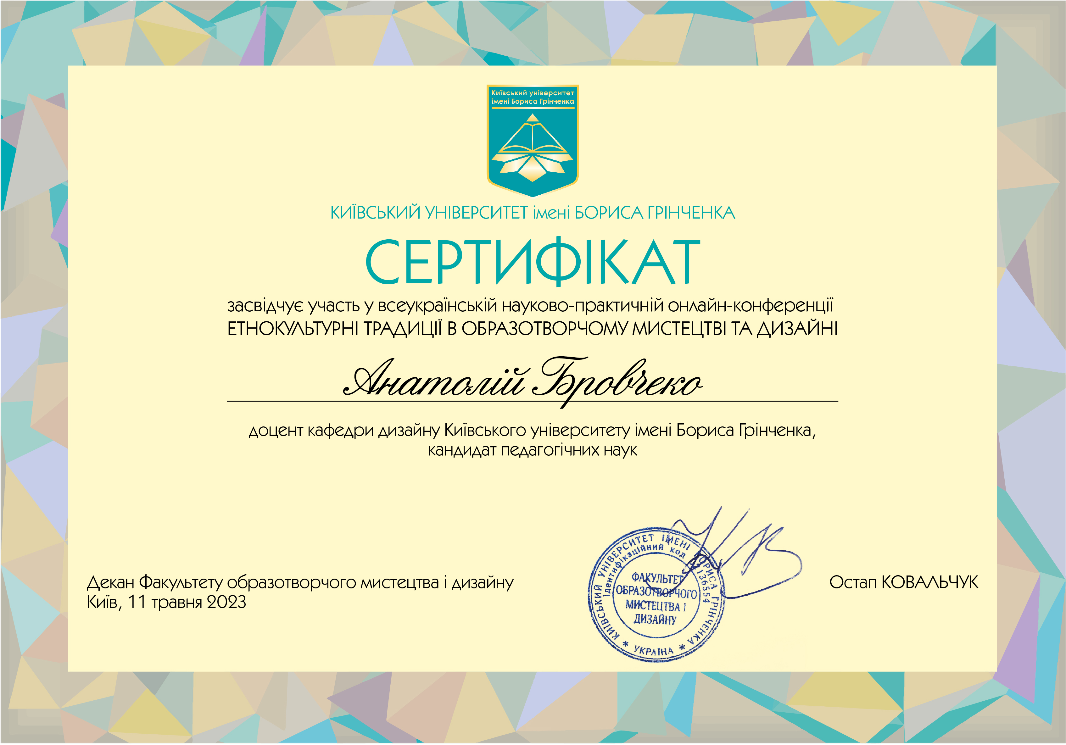 | 986 | Факультет образотворчого мистецтва і дизайну | Кафедра дизайну | 11 | 4 | 2025 | https://www.researchgate.net/scientific-contributions/Anatolii-Brovchenko-2265313481 |
