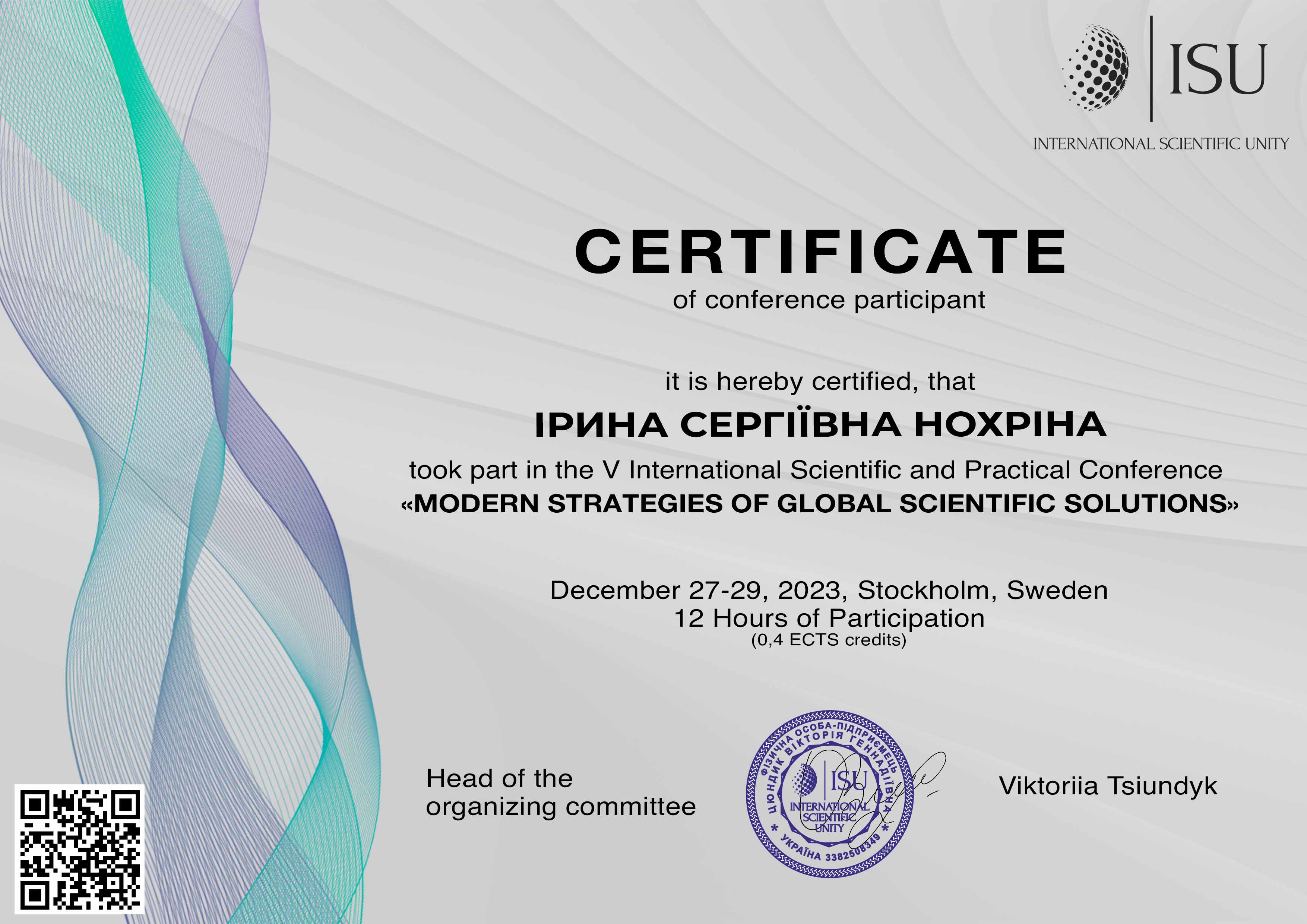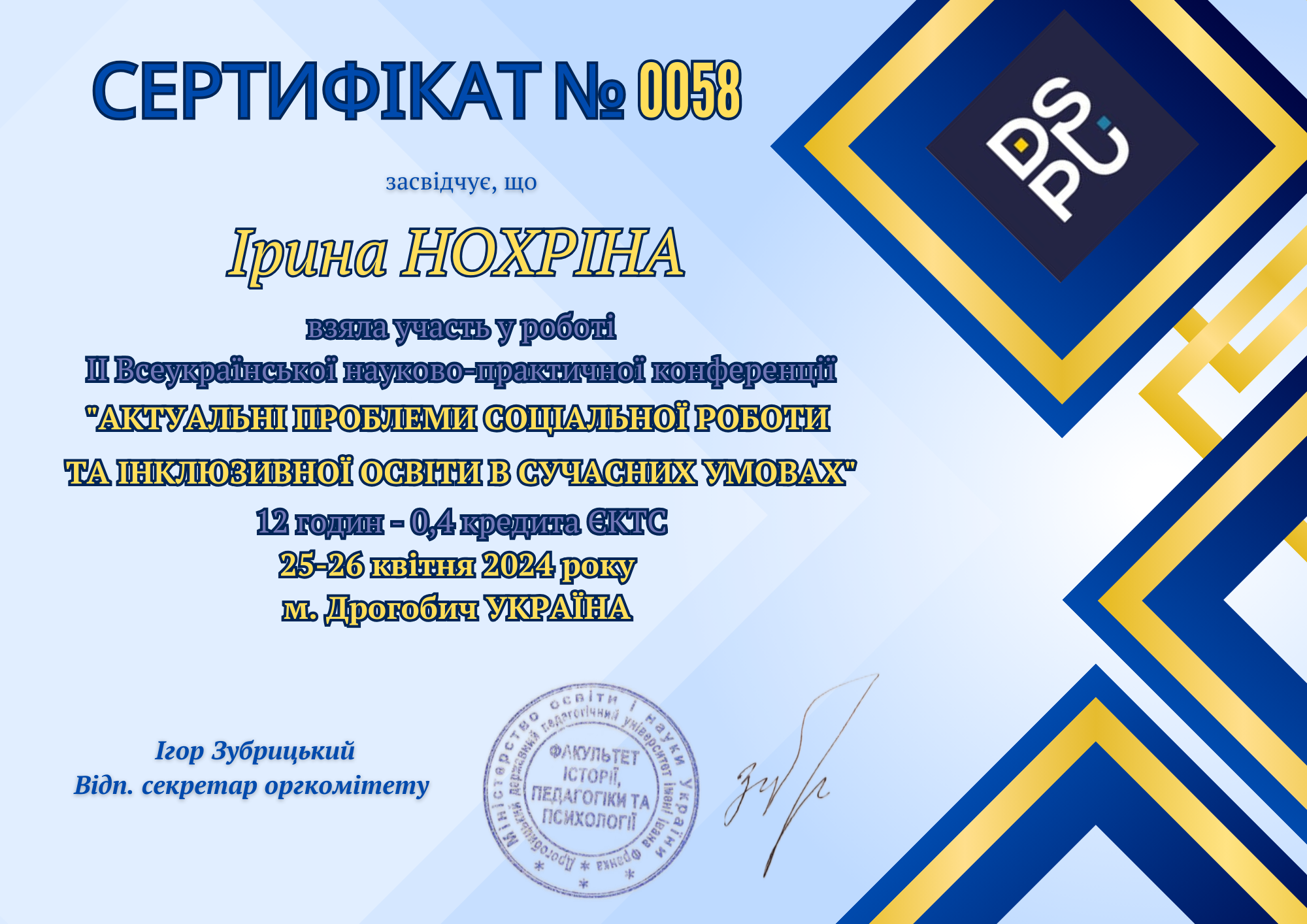| ID | Назва | Тема доповіді | Місце проведення | Документ, що засвідчує | Дата проведення |