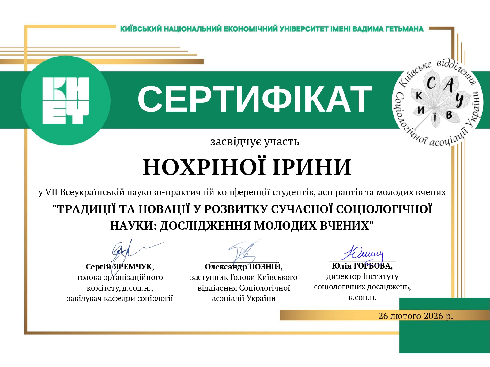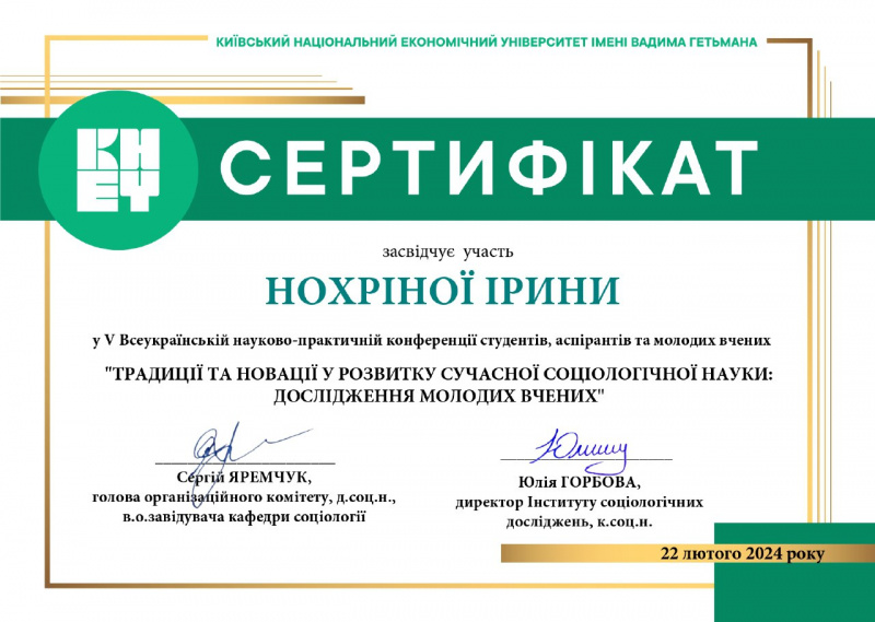 | 10191 | Традиції та новації у розвитку сучасної соціологічної науки: дослідження молодих вчених | Життєстійкість студентської молоді у періоди життєвих викликів та труднощів | Київ |