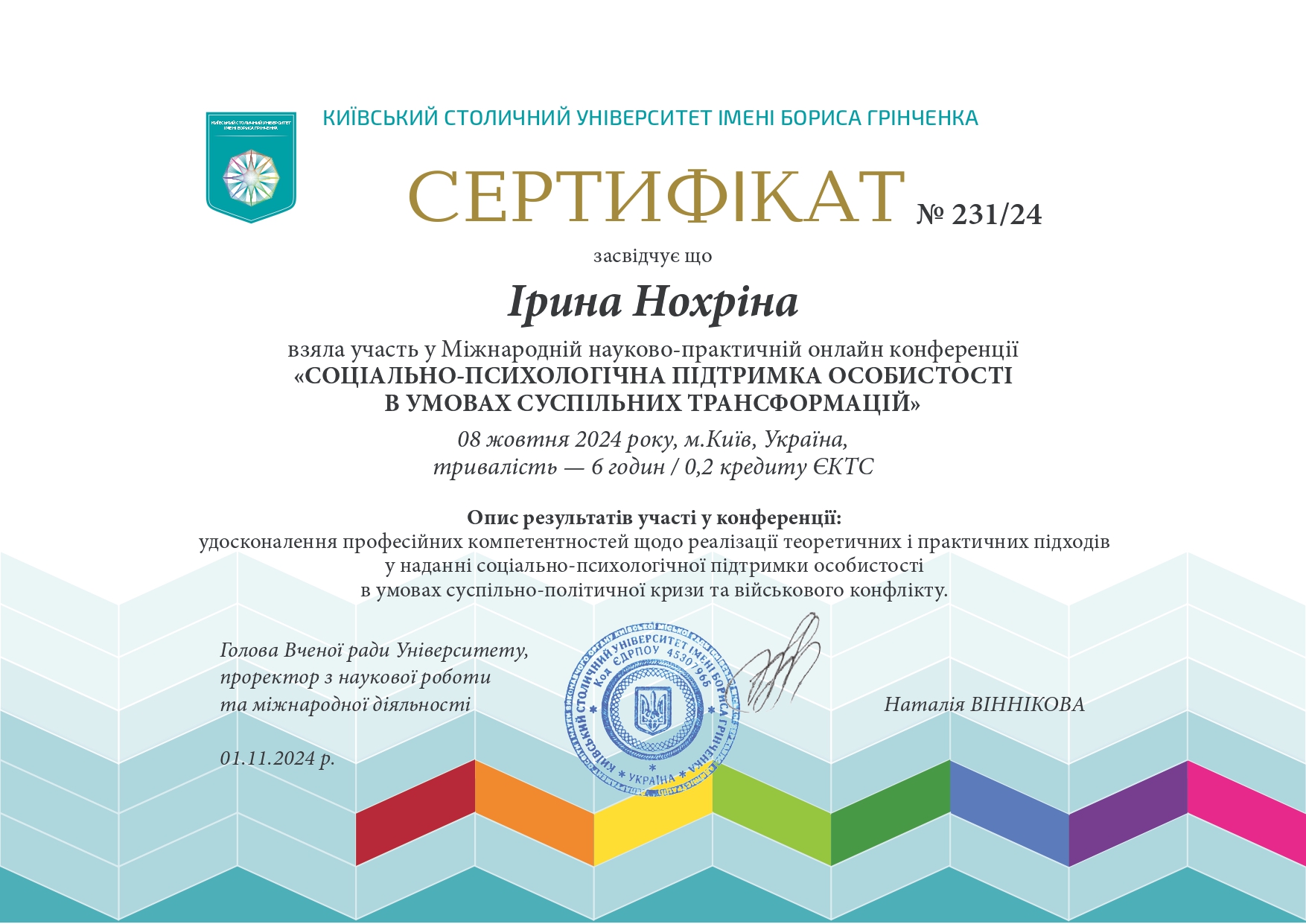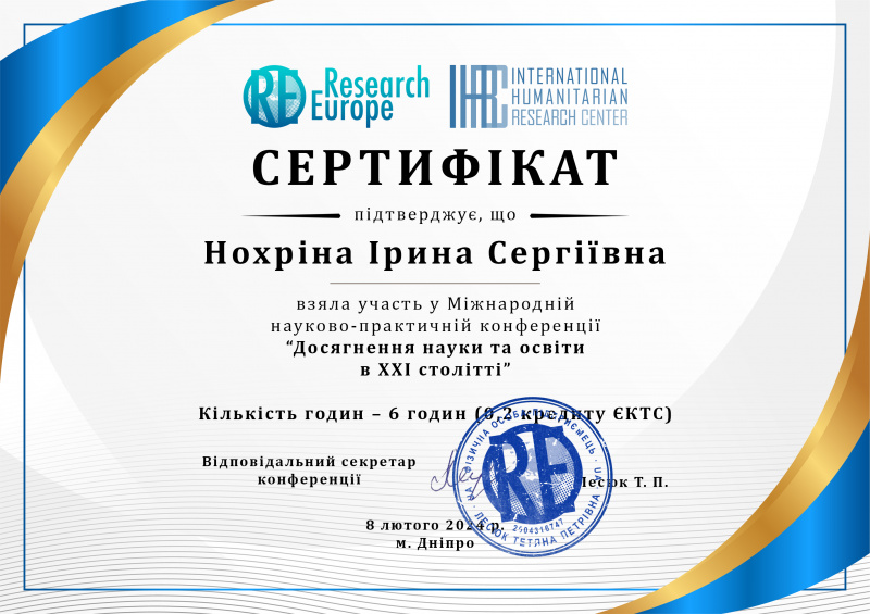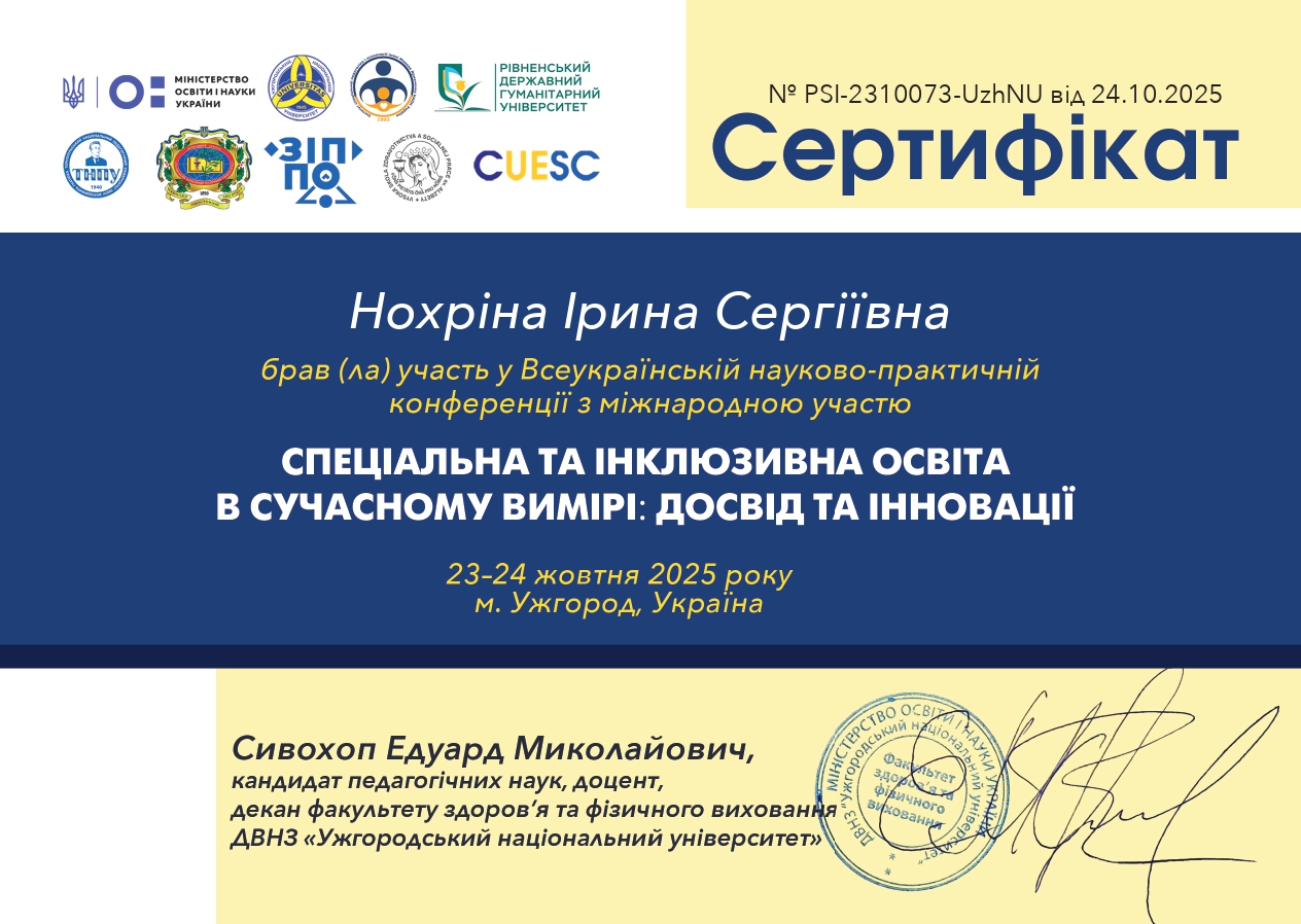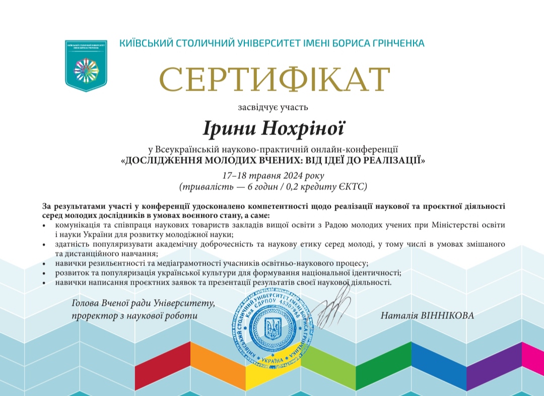 | 12017 | VI Міжнародна науково-практична конференція студентів та молодих учених «Освітні і культурно-мистецькі практики в контексті інтеграції України у міжнародний науково-інноваційний простір в умовах воєнного часу» | Соціально-психологічні детермінанти рівня домагань студентів в умовах воєнного стану | Запоріжжя |