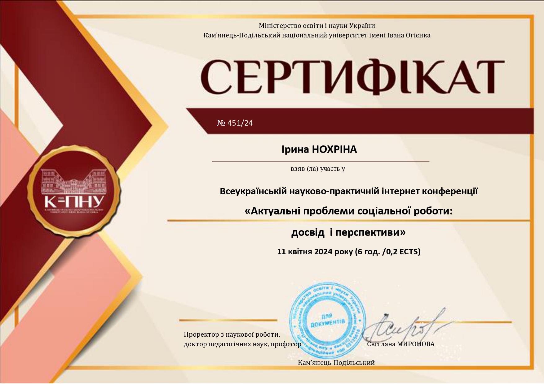 | 10255 | Всеукраїнській науково-практичній конференції "Актуальні проблеми соціальної роботи: досвід і перспективи" | "Волонтерська діяльність, як засіб формування соціальної успішності | Кам'янець-Подільський |