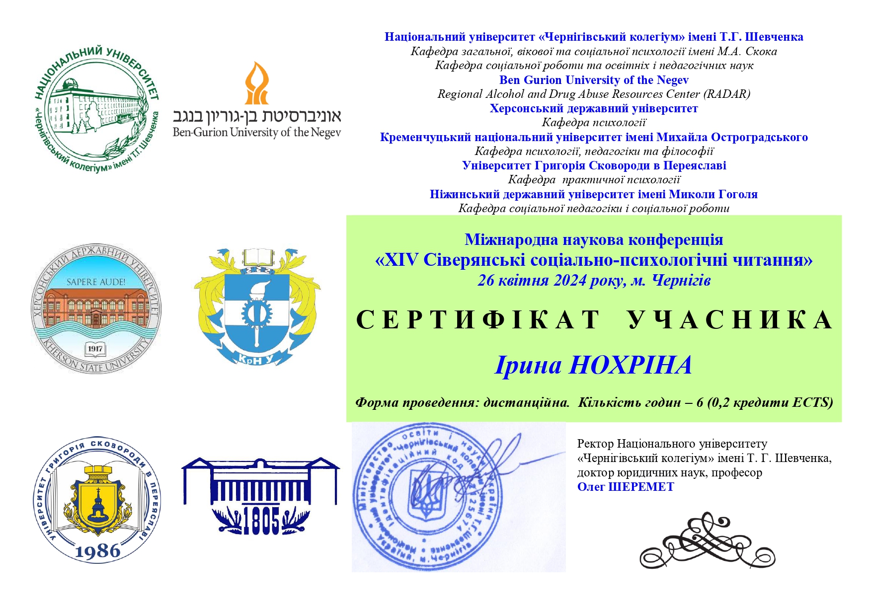 | 10301 | Чотирнадцяті Сіверські Соціально-психологічні читання | Розвиток соціальної успішності студентів у закладі вищої освіти | Чернігів |