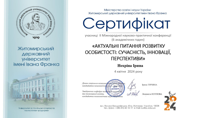 | 10332 | ІІ Міжнародна науково-практична конференція АКТУАЛЬНІ ПИТАННЯ РОЗВИТКУ ОСОБИСТОСТІ: СУЧАСНІСТЬ, ІННОВАЦІЇ, ПЕРСПЕКТИВИ» | Життєві стратегії студентської молоді" | м. Житомир |