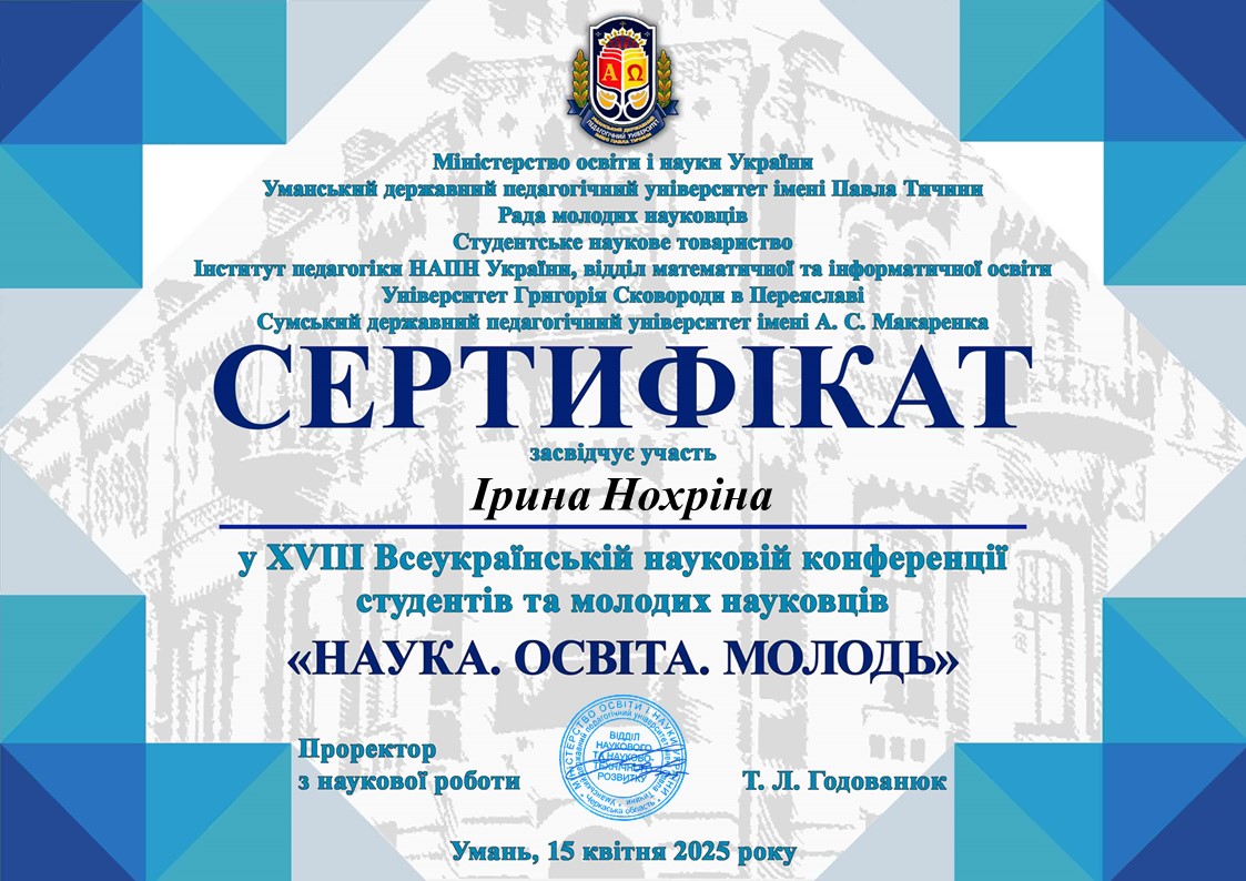 | 11816 | VIIІ Всеукраїнська наукова конференція студентів та молодих науковців «НАУКА. ОСВІТА. МОЛОДЬ» | Технологія е-портфоліо як інструмент для фіксації освітніх і соціальних досягнень студентів | Умань |