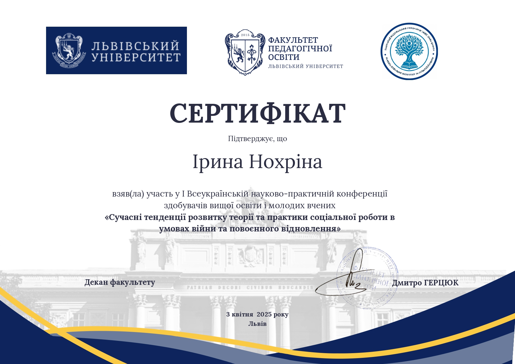 | 11837 | Сучасні тенденції розвитку теорії та практики соціальної роботи в умовах війни та післявоєнного відновлення | Соціальна адаптація першокурсників у закладах вищої освіти в умовах війни | м. Львів |