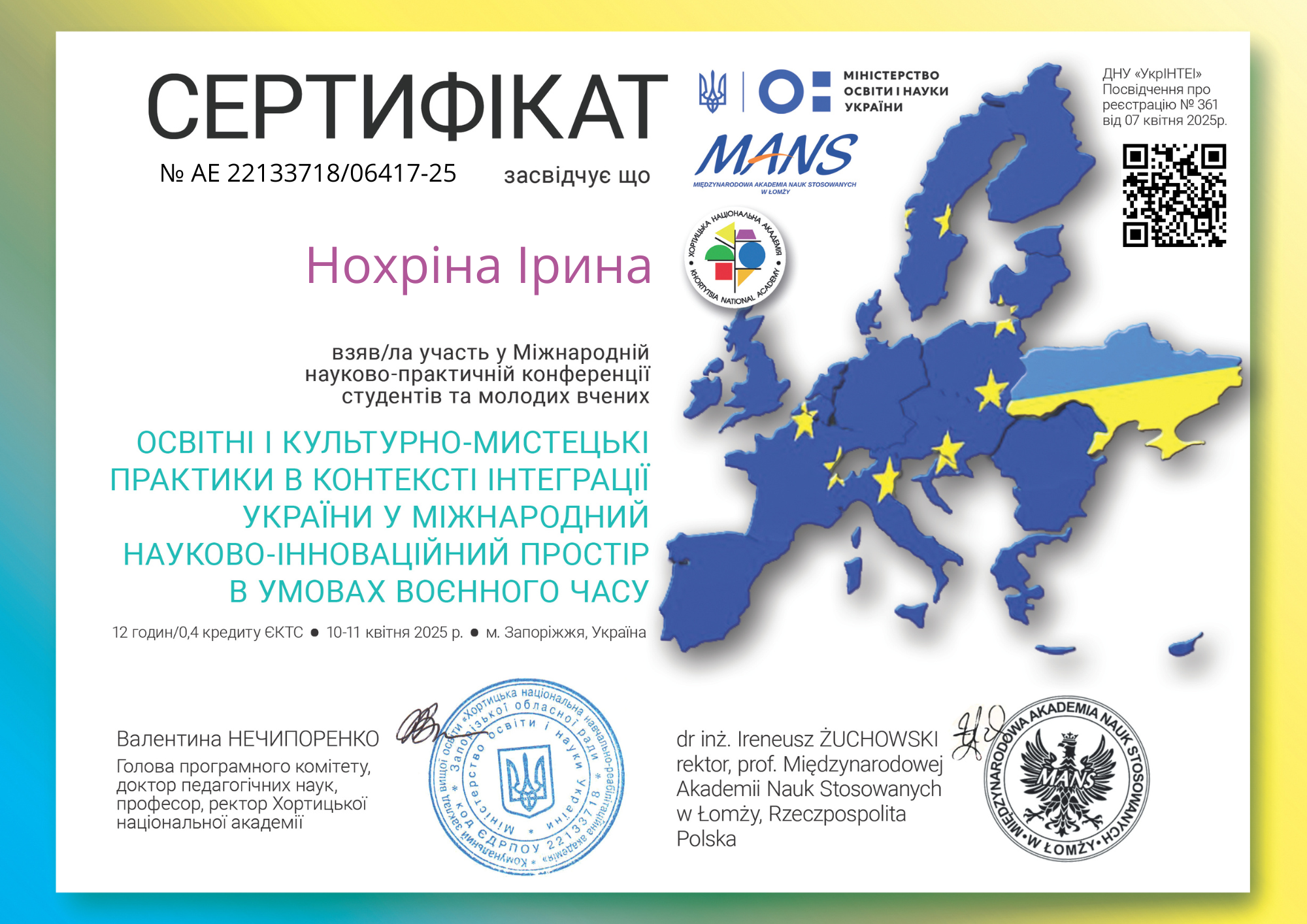 | 10601 | Освітні і культурно-мистецькі практики в контексті інтеграції України у міжнародний науково-іноваційний простір в умовах воєнного часу | Освіта як складова успішної практичної професійної діяльності майбутніх соціальних працівників | Запоріжжя |