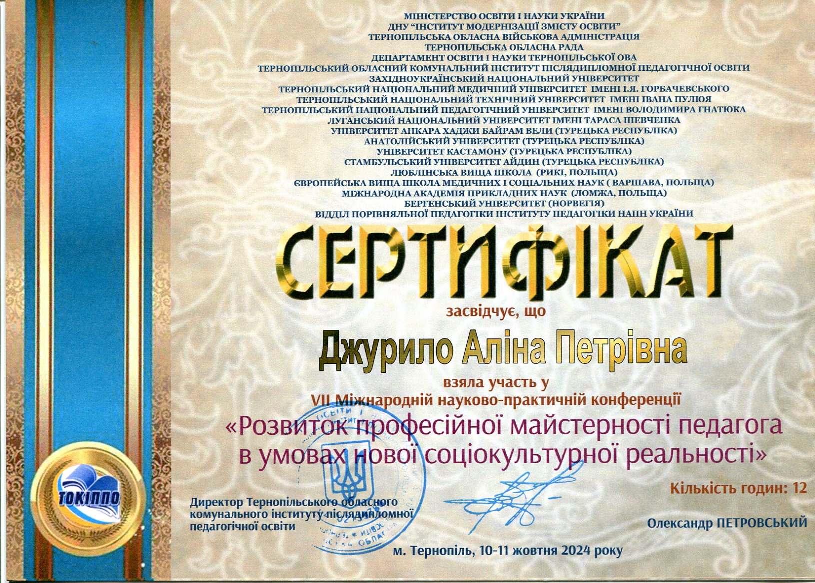 | 12953 | VІІІ Міжнародної науково-практичної конференції «Розвиток професійної майстерності педагога в умовах нової соціокультурної реальності» | Професійний розвиток для викладання учням з особливими освітніми потребами: європейський досвід | м. Тернопіль, Тернопільський обласний комунальний інститут післядипломної педагогічної освіти | document.pdf | |