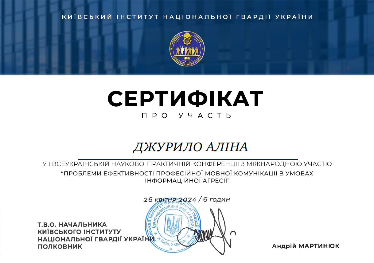| 11470 | Проблеми ефективності професійної мовної комунікації в умовах інформаційної агресії | Сучасна міжкультурна комунікація у глобалізованому світі: досвід Європейського Союзу для України | м. Київ, Київський інститут Національної гвардії України |