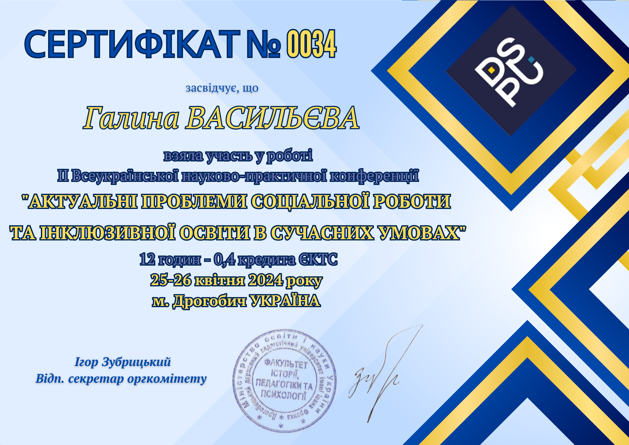 | 10701 | Актуальні проблеми соціальної роботи та інклюзивної освіти в сучасних умовах | Застосування технології спільного викладання в умовах інклюзивного навчання | м. Дрогобич, ДДПУ імені І. Франка |
