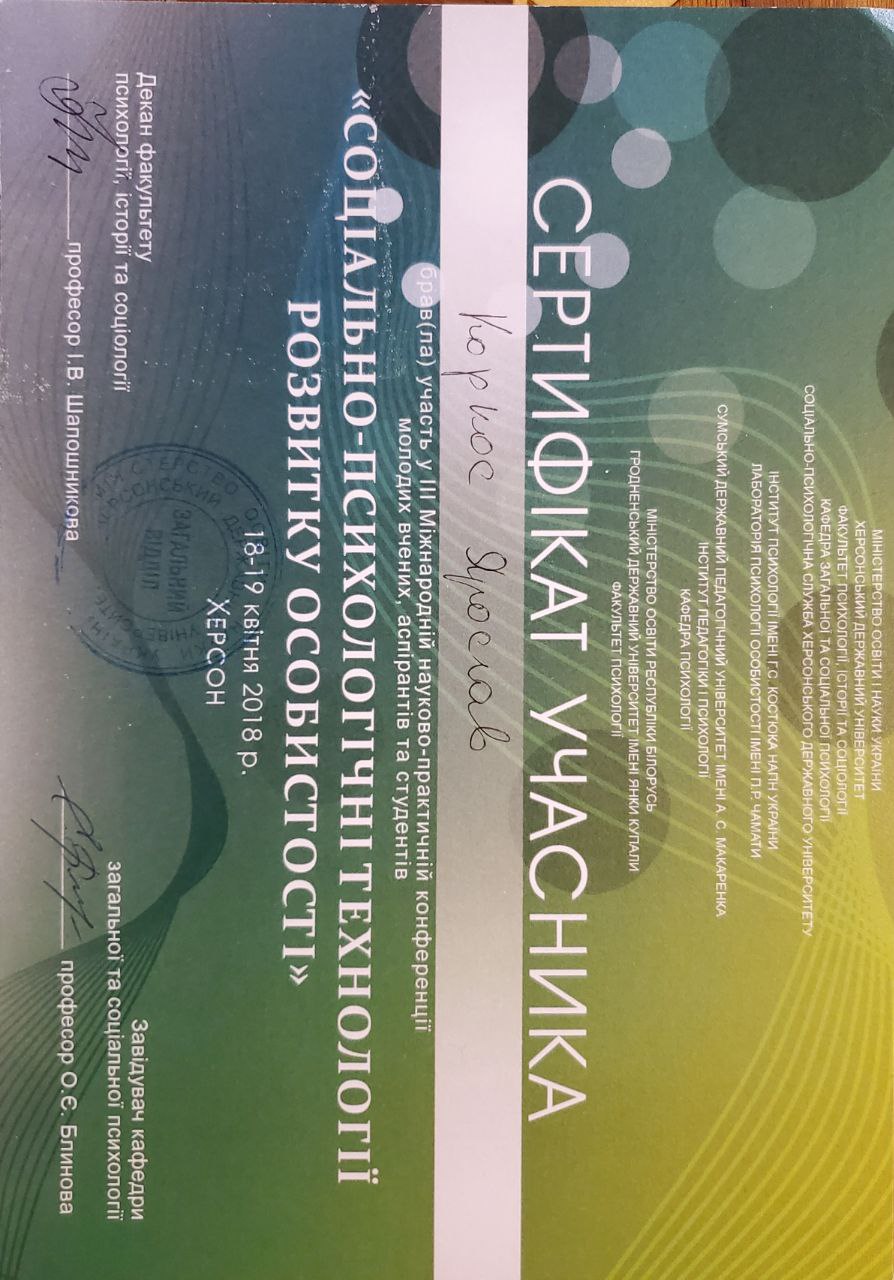 | 1208 | Факультет психології, соціальної роботи та спеціальної освіти | Кафедра практичної психології | 5.7 | 1 | 2025 | https://www.researchgate.net/profile/Yaroslav-Korkos-2 |