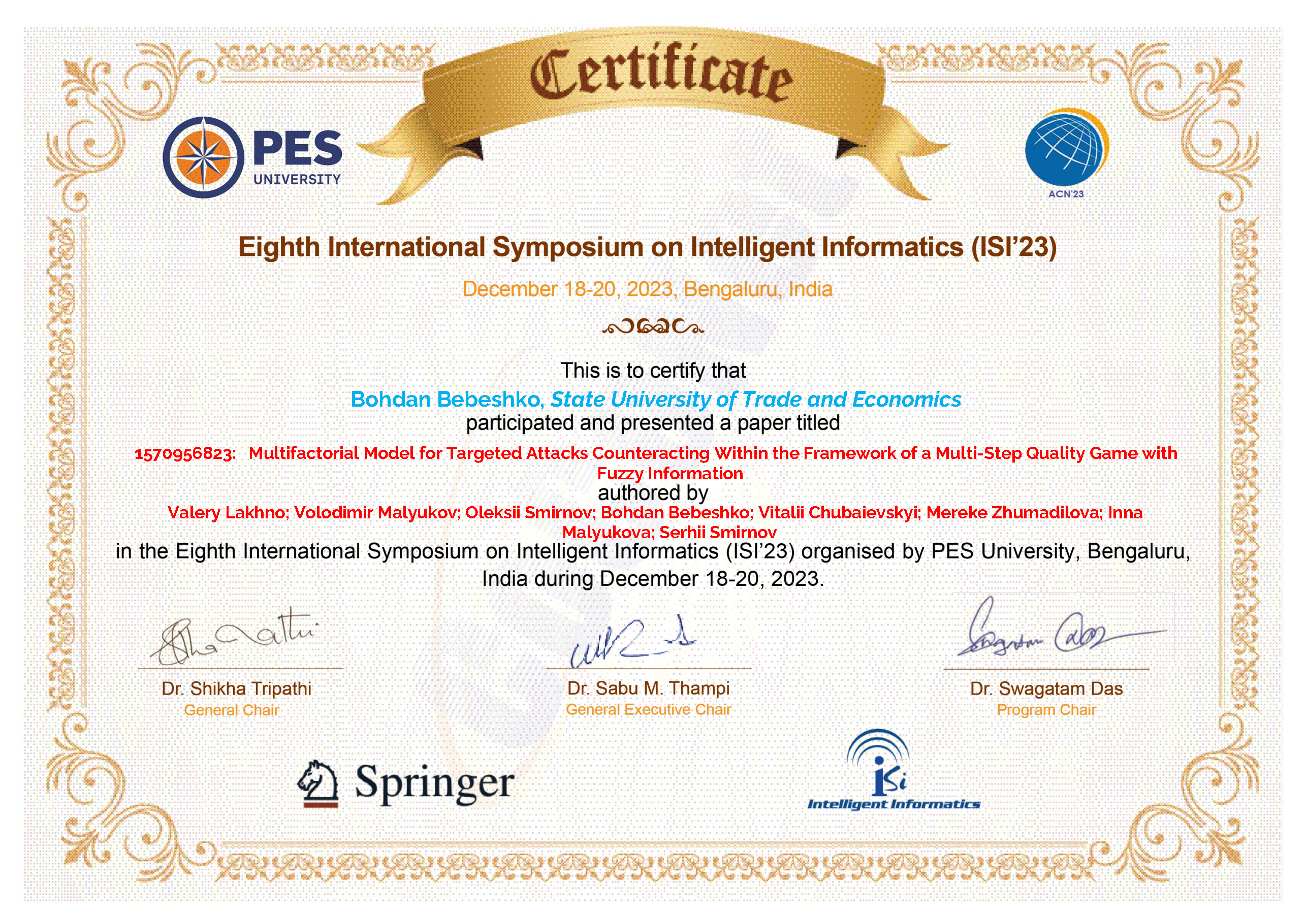 | 11680 | Eighth International Symposium on Intelligent Informatics (ISI'23) | Multifactorial Model for Targeted Attacks Counteracting Within the Framework of a Multi-Step Quality Game with Fuzzy Information | PES University, Bengaluru, India |
