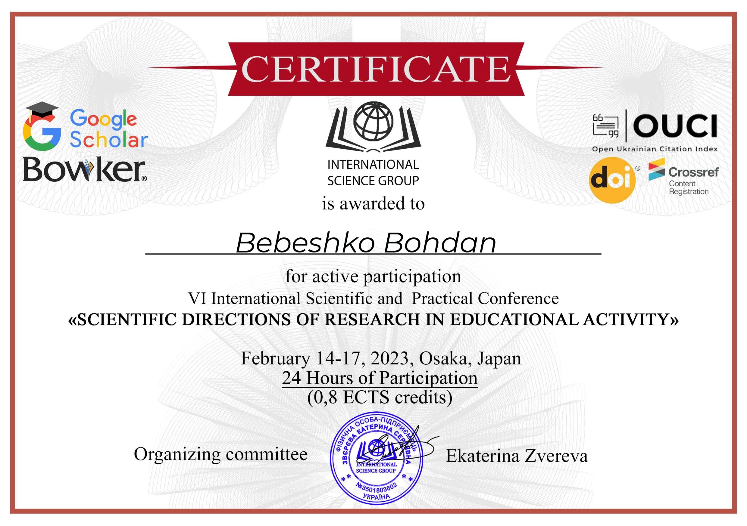 | 11681 | VI International Scientific and Practical Conference "Scientific directions of research in educational activity" | ENHANCING STOCK MARKET PREDICTIVE ACCURACY THROUGH THE APPLICATION OF CONVOLUTIONAL NEURAL NETWORKS | Osaka, Japan |