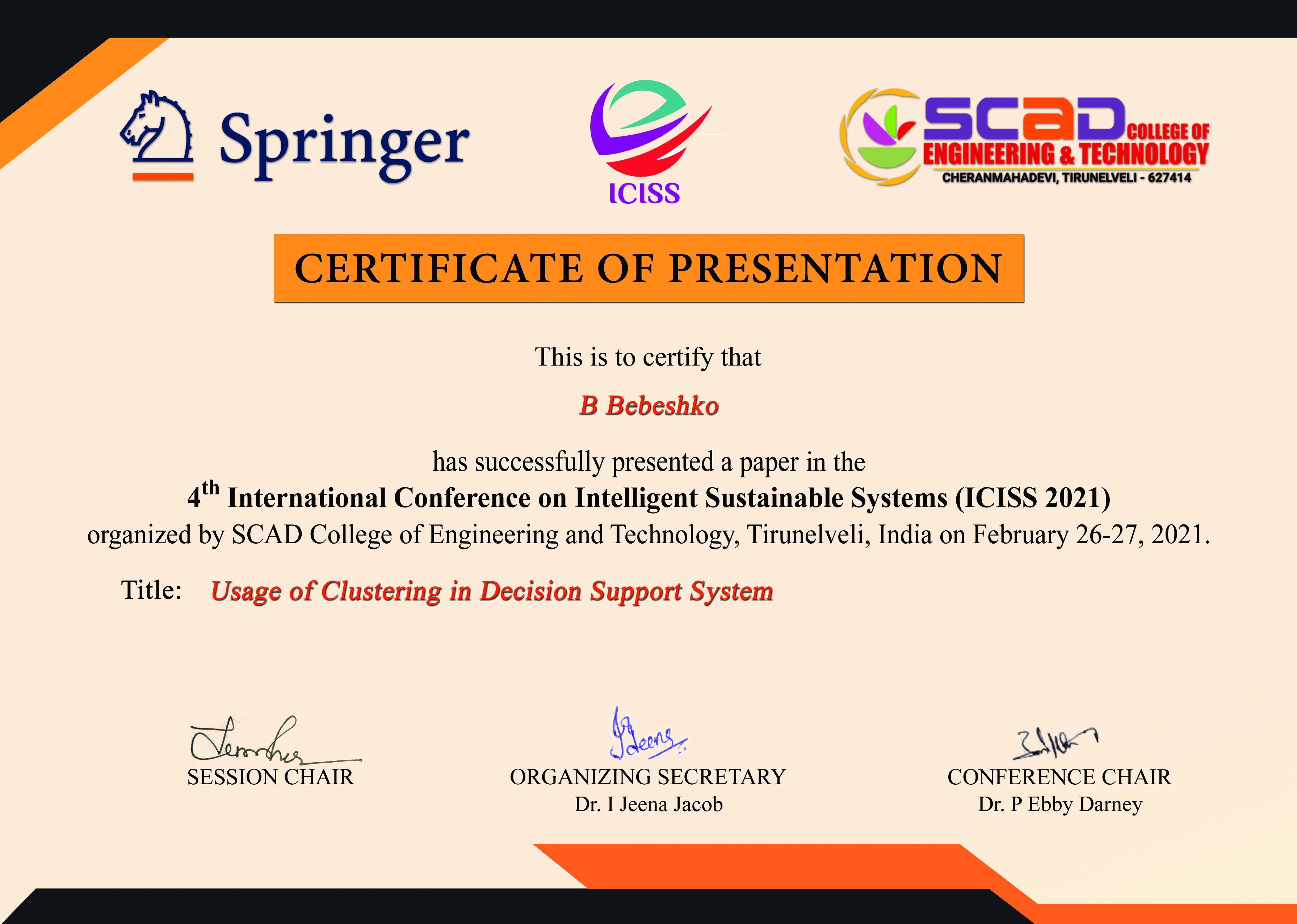 | 11682 | 4th International Conference on Intelligent Sustainable Systems (ICISS 2021)) | Usage of Clustering in Decision Support System | SCAD College of Engineering and Technology, Tirunelveli, India |