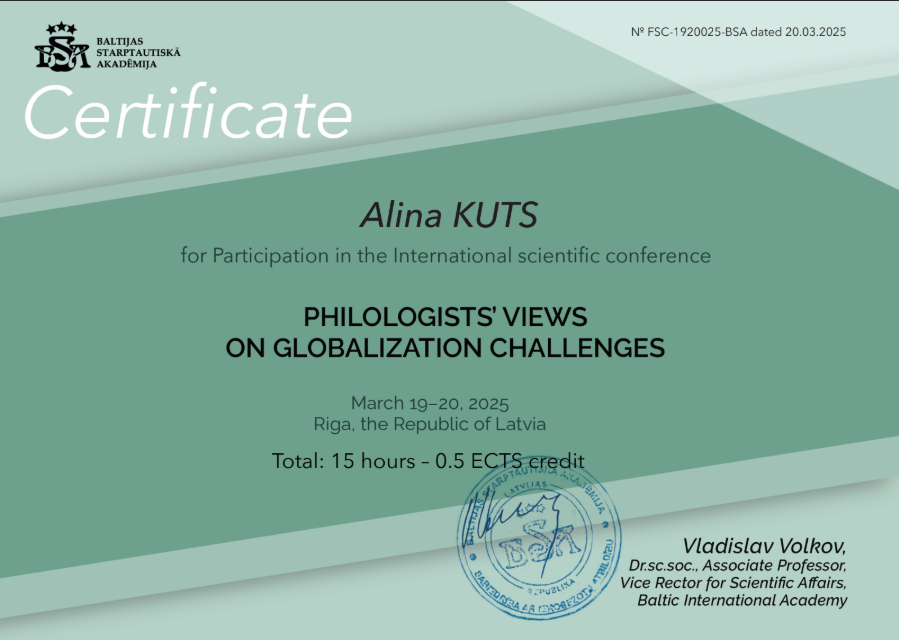| 11895 | The International Scientific Conference “Philologists’ Views on Globalization Challenges” | Функції та структура вокативних звернень у ранньоновоанглійських листах | м.Рига |