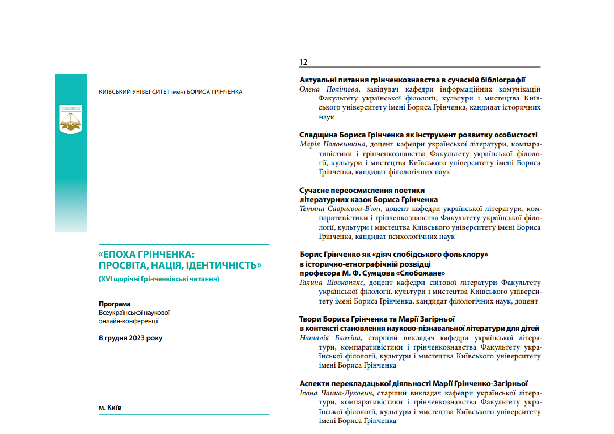 | 10142 | Епоха Грінченка: просвіта, нація, ідентичність | Сучасне переосмислення поетики літературних казок Бориса Грінченка | Київ |