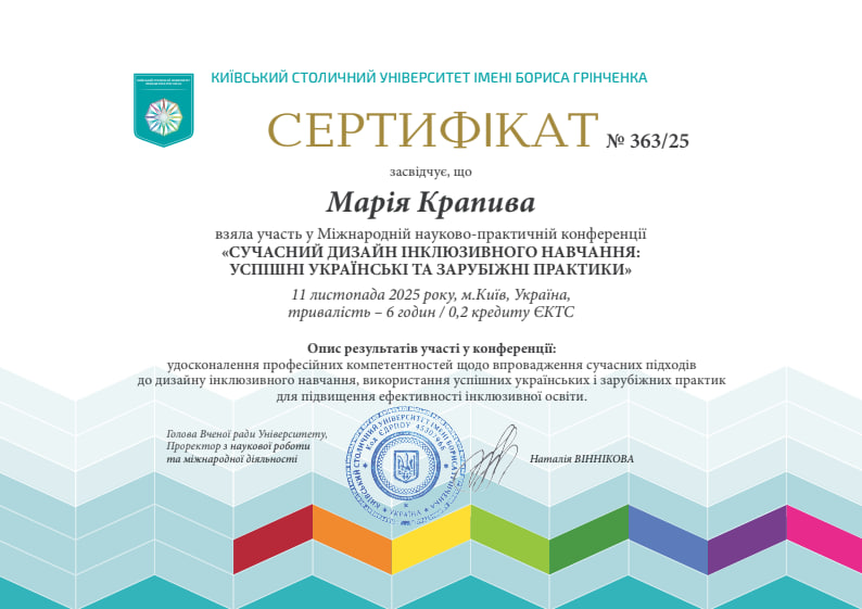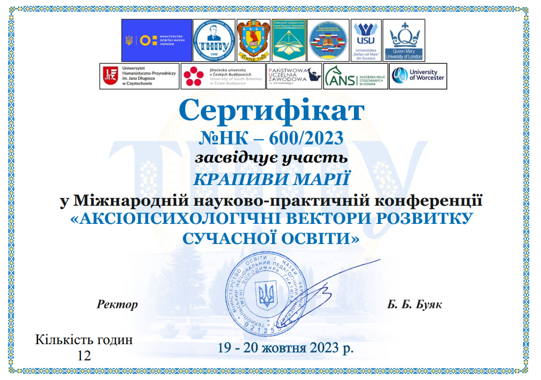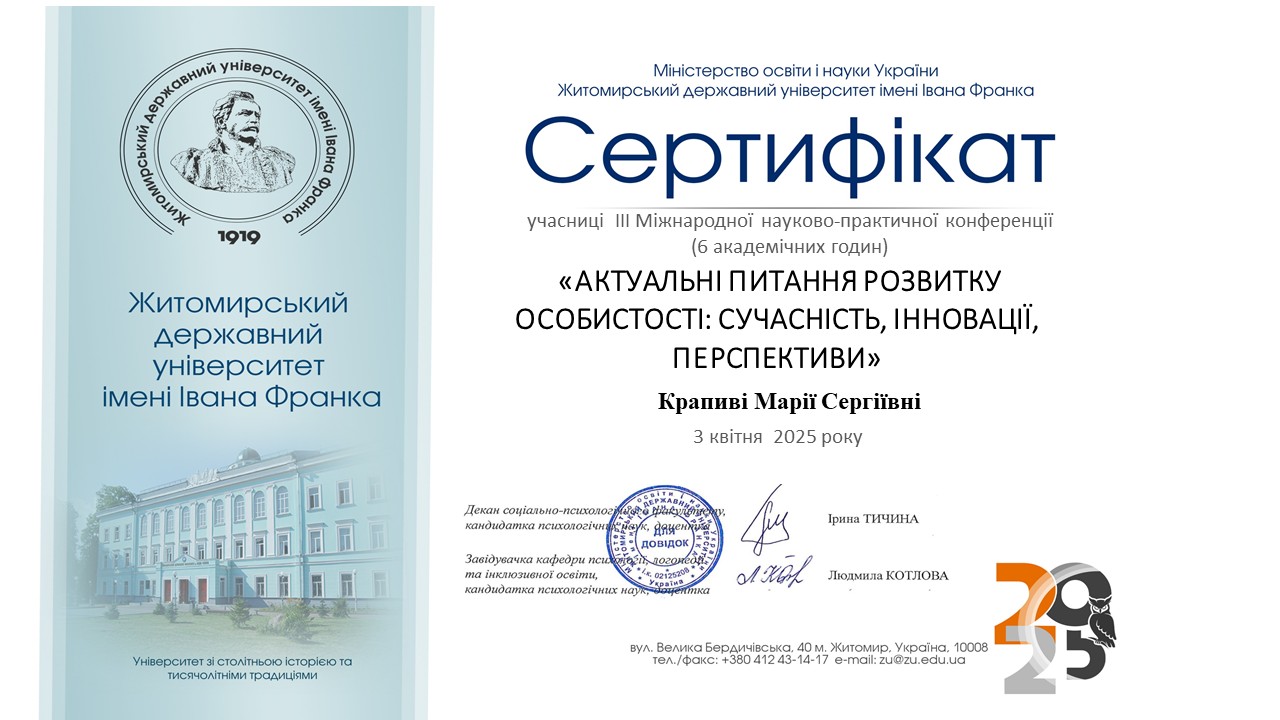| 1293 | Факультет психології, соціальної роботи та спеціальної освіти | Кафедра практичної психології | 1.9 | 0 | 2025 | https://www.researchgate.net/profile/Mariia-Krapyva/stats |