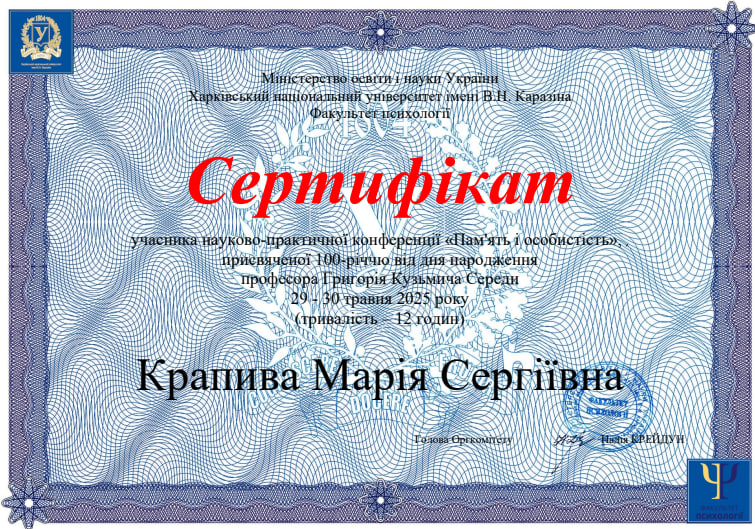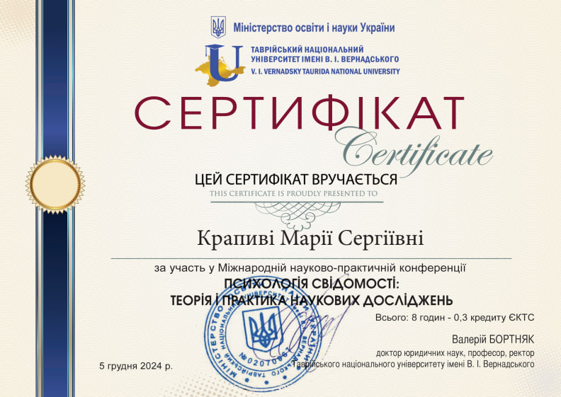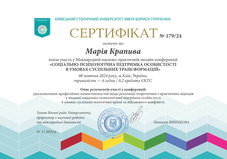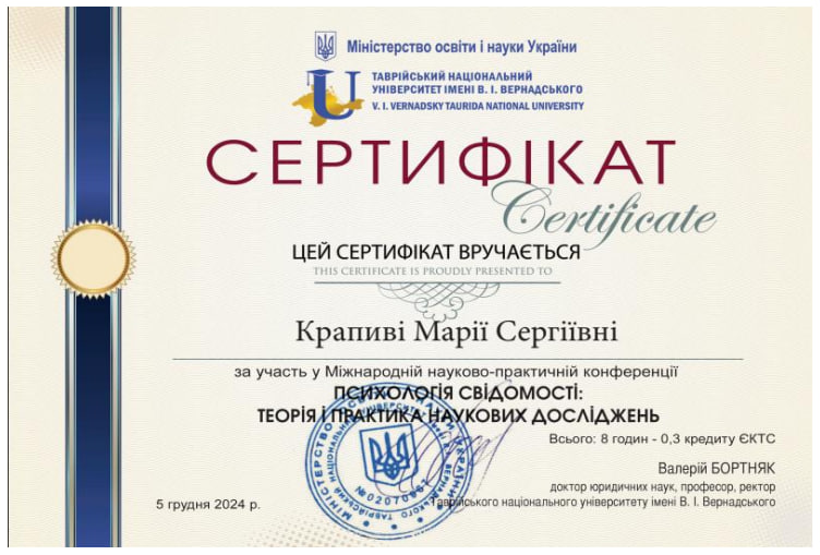 17.03.2025 - по теперішній час - ФОП - Крапива Марія Сергіївна - психолог-консультант, практичний психолог.