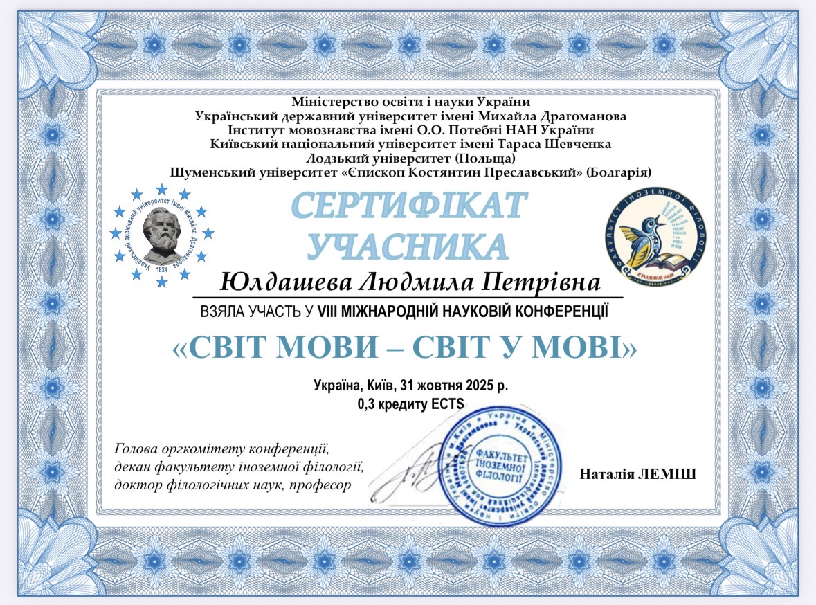 2019 Таврійський національний університет імені В.І.Вернадського. Доцент кафедри словʼянської і романо-германської філології.