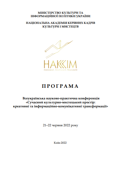 | 8714 | Всеукраїнська науково-практична конференція "Сучасний культурно-мистецький простір: креативні та інформаційно-комунікативні трансформації. | Інформаційно-комунікативні технології у мистецькій освіті: специфіка та типологія | м.Київ |