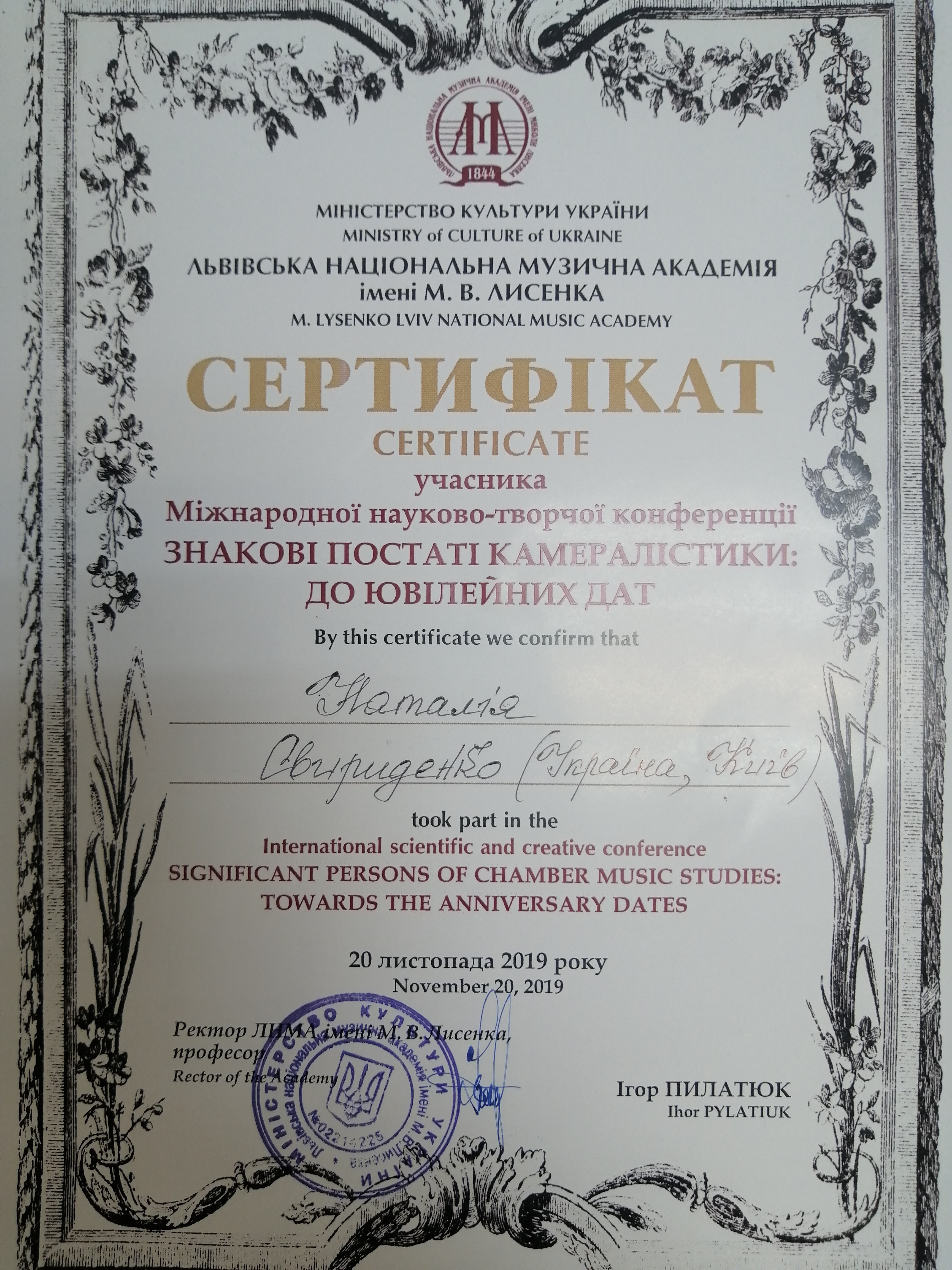 | 8601 | Міжнародна науково-творча конференція "Знакові постаті камералістики: до ювілейних дат" | Єлизавета Білоградська та камерна музика часів гетьмана Кирила Розумовського (280 років від дня народження) | Львів |