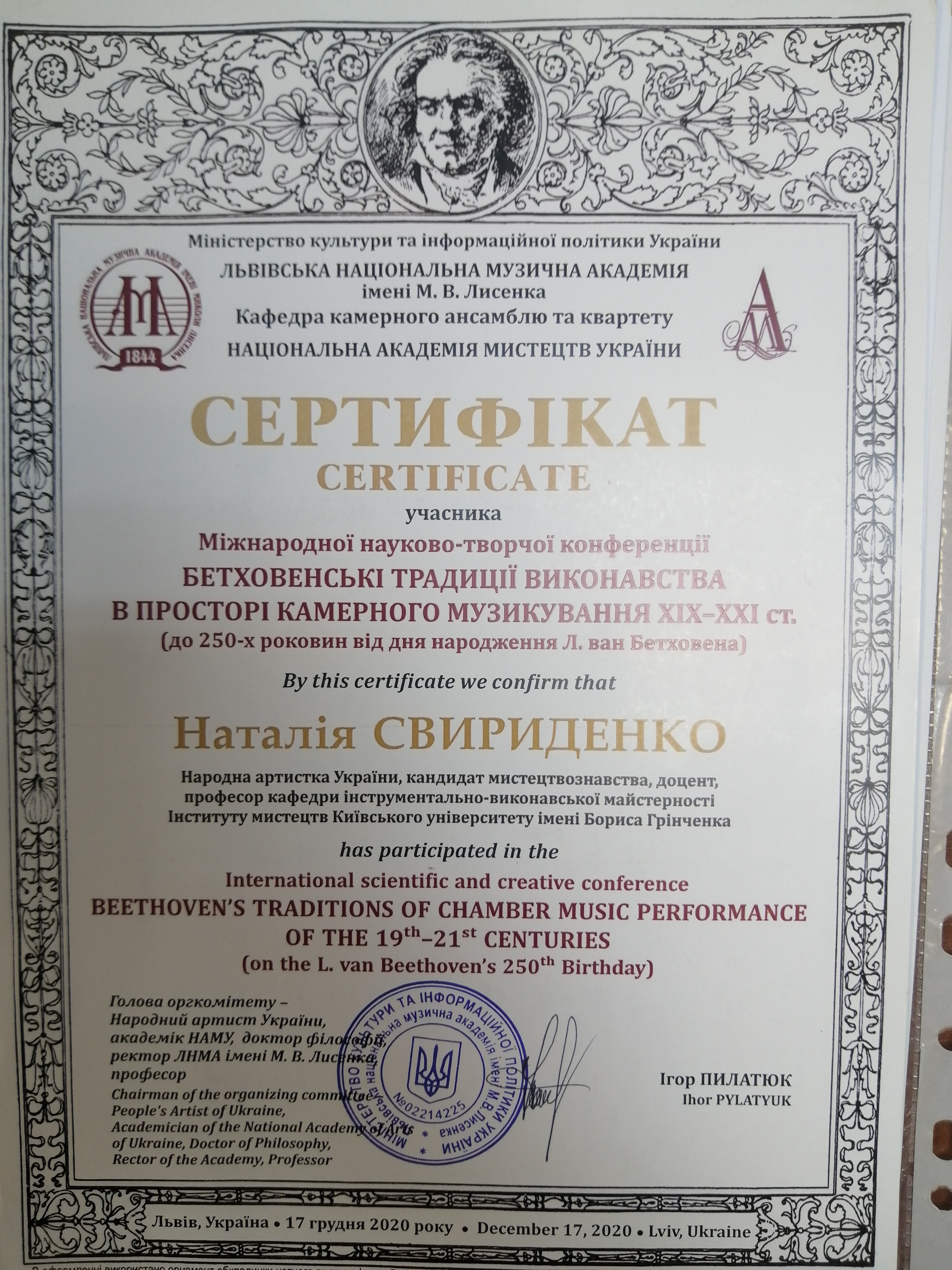 | 8602 | Міжнародна науково-творча конференція "Бетховенські традиції виконавства в просторі камерного музикуваннч XIX-XXI ст." | Людвіг ван Бетховен і Україна | Львів |