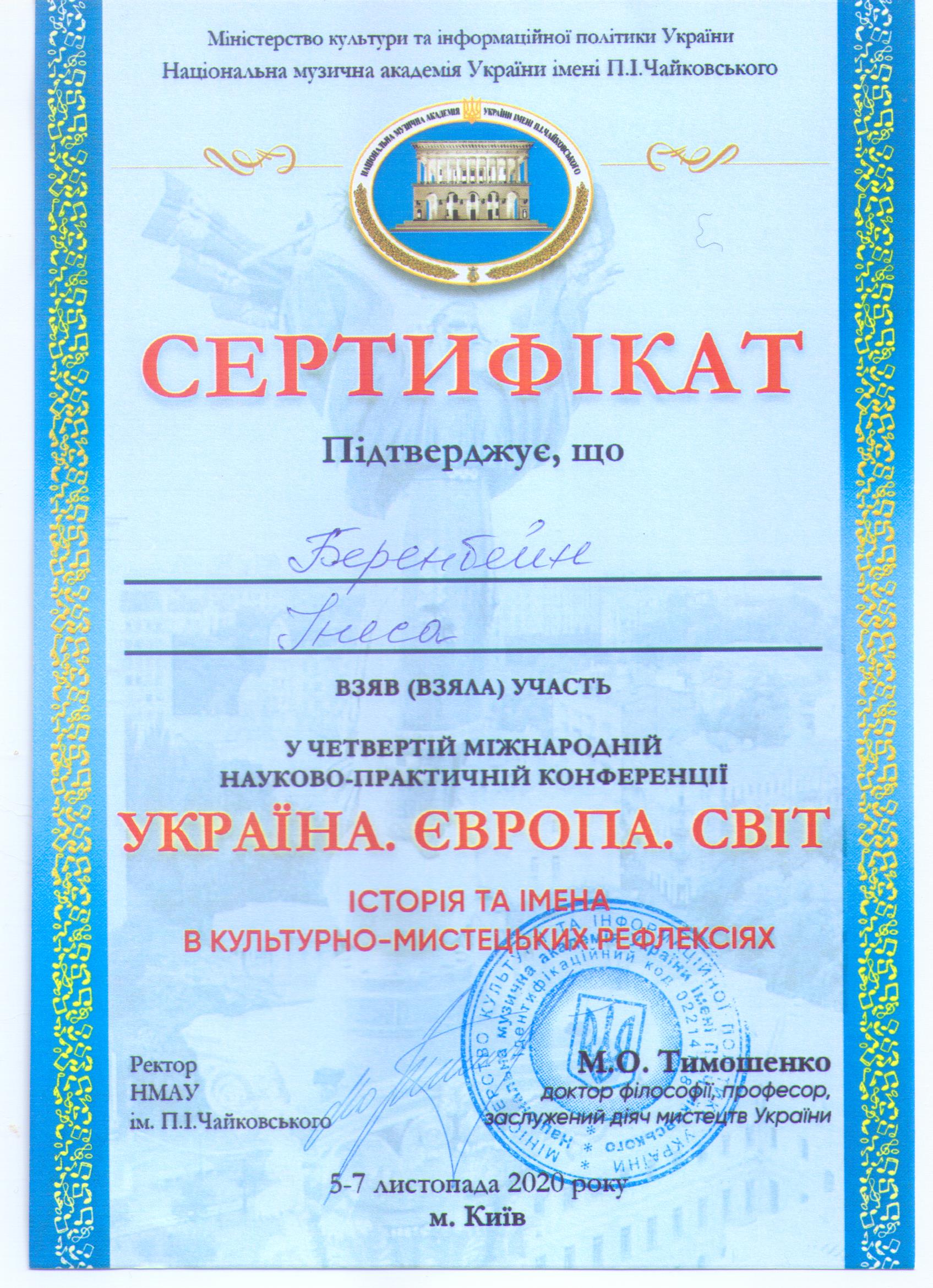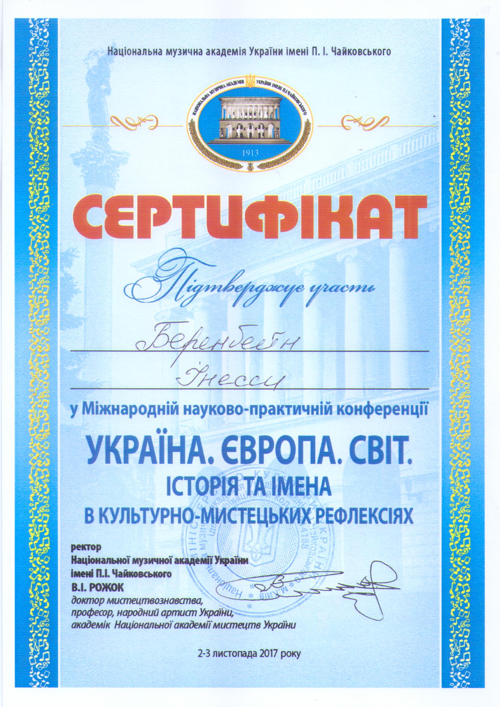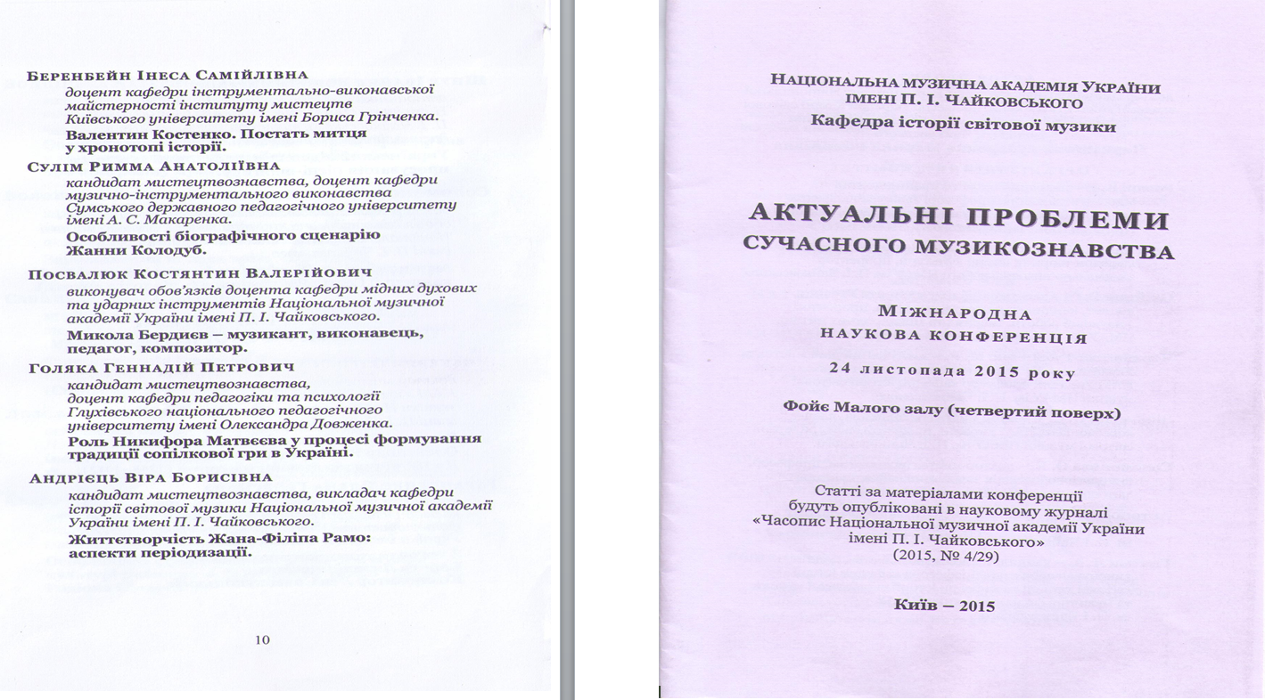 | 8548 | Україна. Європа. Світ. Історія та імена в культурно-історичних рефлексіях | Камерність як вияв романтичних рефлексій фортепіанної творчості Миколи Лисенка | Національна музична академія України, м.Київ |