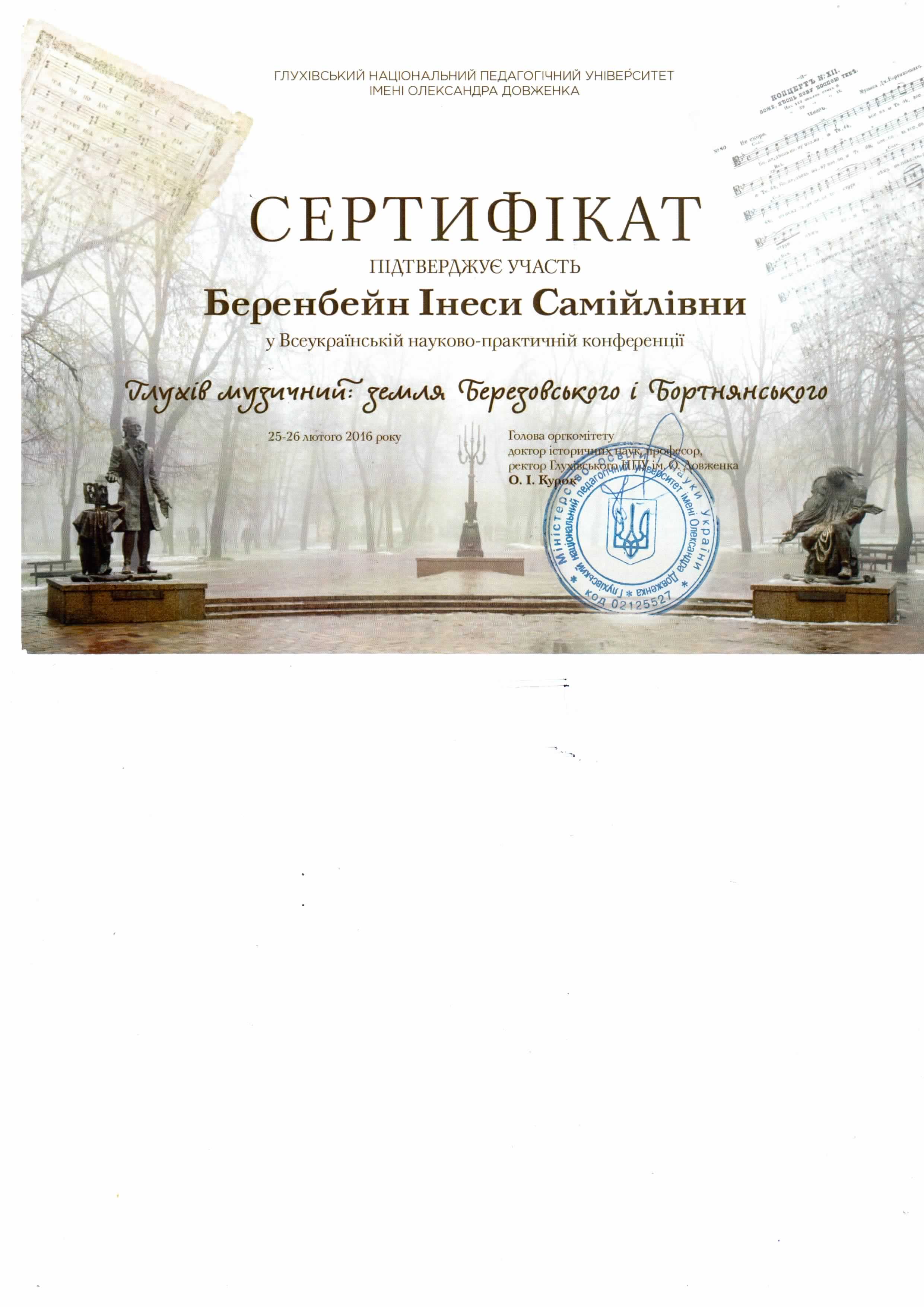 | 2708 | Глухів музичний: земля Березовського і Бортнянського | Особливості інтерпретації фортепіанних творів М.Лисенка | Глухівський національний педагогічний університет імені Олександра Довженка | document.pdf | |