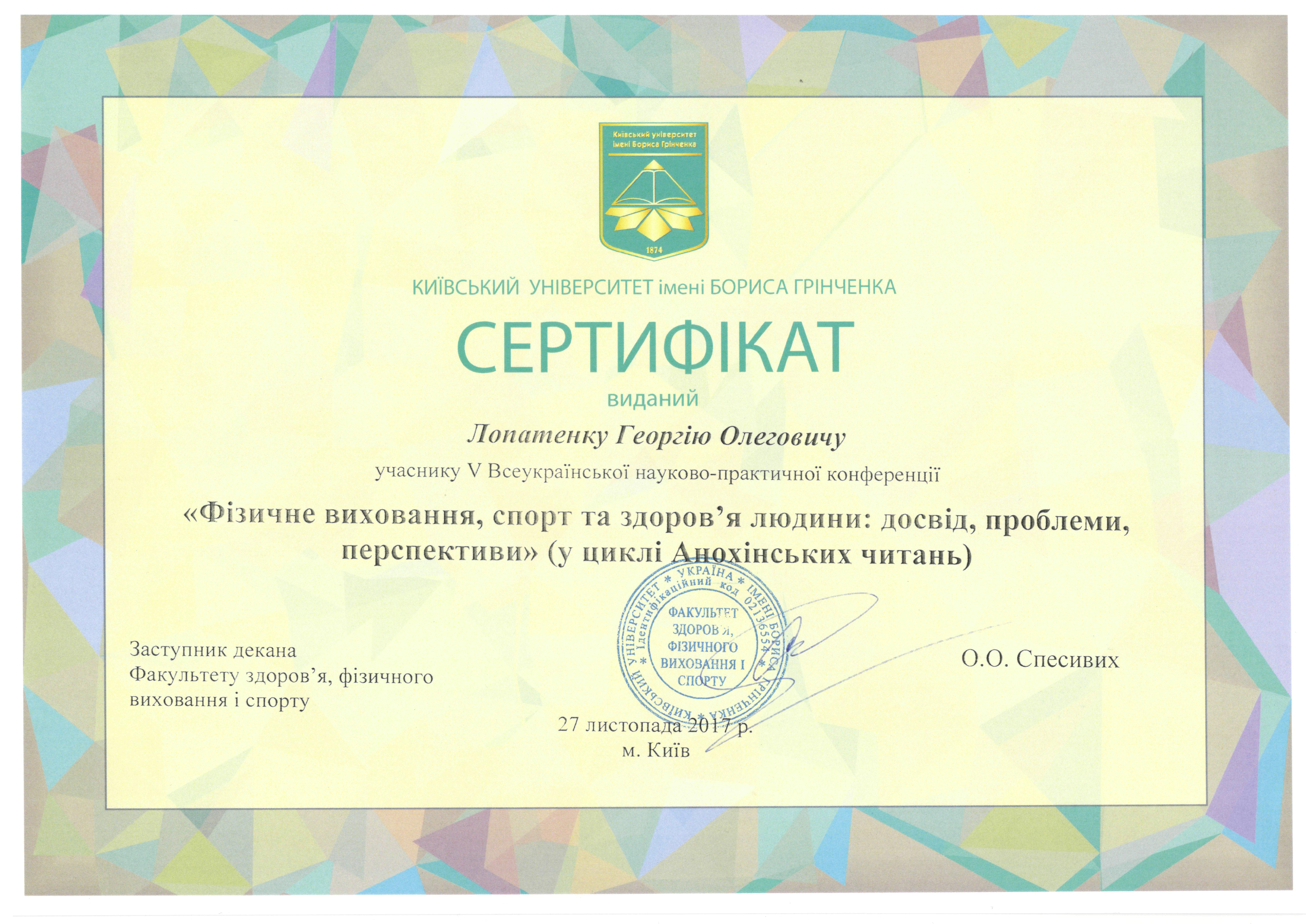 | 150 | Лопатенко Георгій Олегович | VI Чемпіонат м. Києва з футзалу серед жіночих студентських команд закладів вищої освіти (сезон 2019/2020) | Київ | Змагання на першість м. Києва | III | Лопатенко.pdf | 2020 |