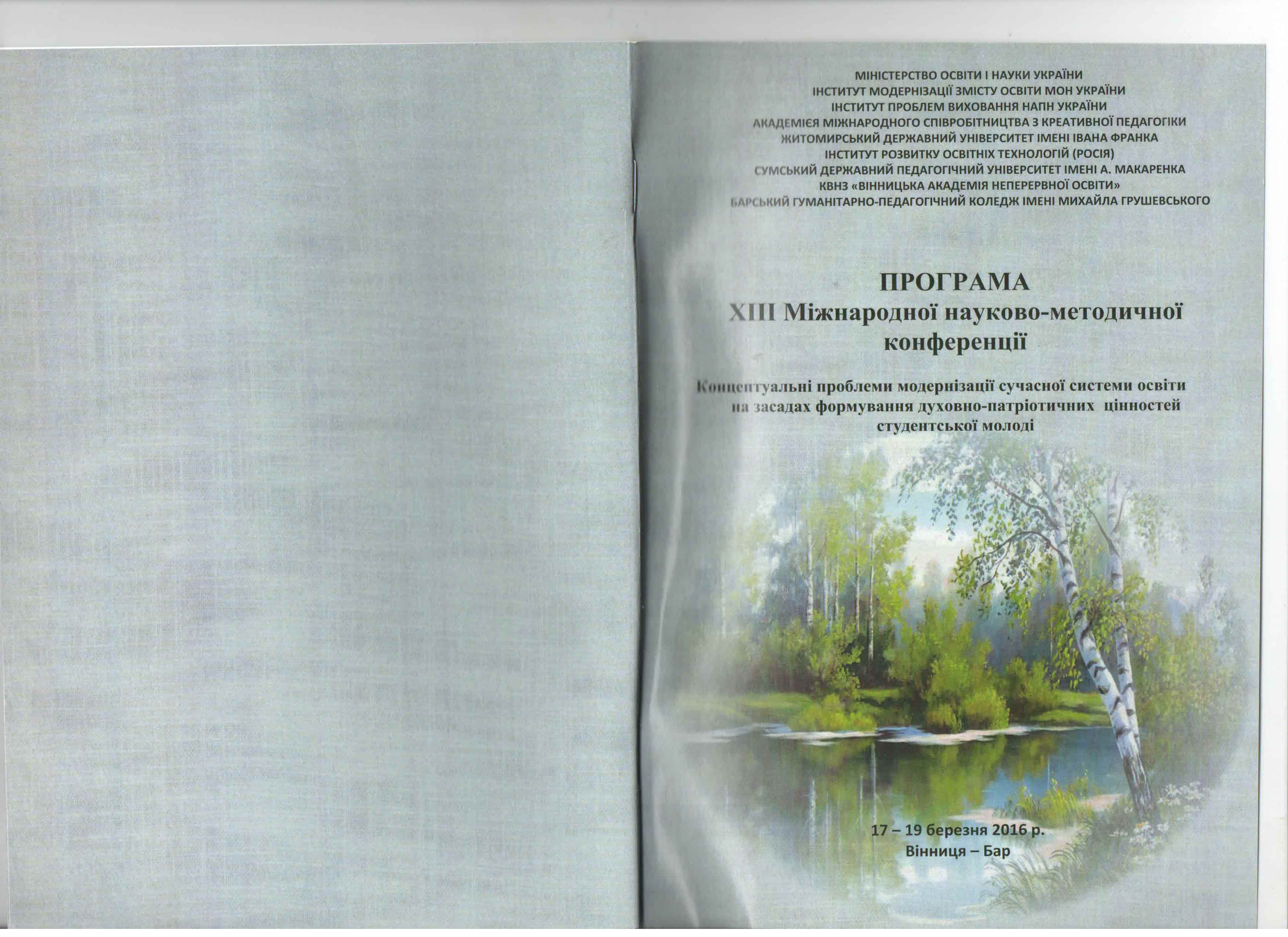 | 3224 | "Моральне-патріотичне виховання студентської молоді в системі вищої освіти" | Формування творчого мислення майбутнього педагога, як провідної навички XXI століття | Бар | document.pdf | |