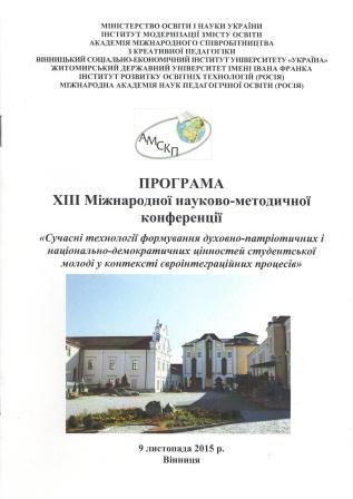 | 223 | Сучасні технології формування духовно-патріотичних і національно-демократичних цінностей студентської молоді у контексті євроінтеграційних процесів | Смислові аспекти професійної компетентності майбутнього педагога | Вінниця |