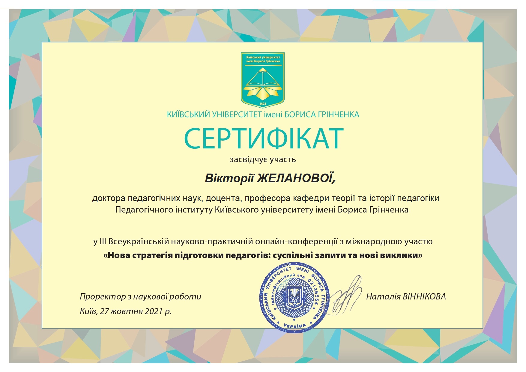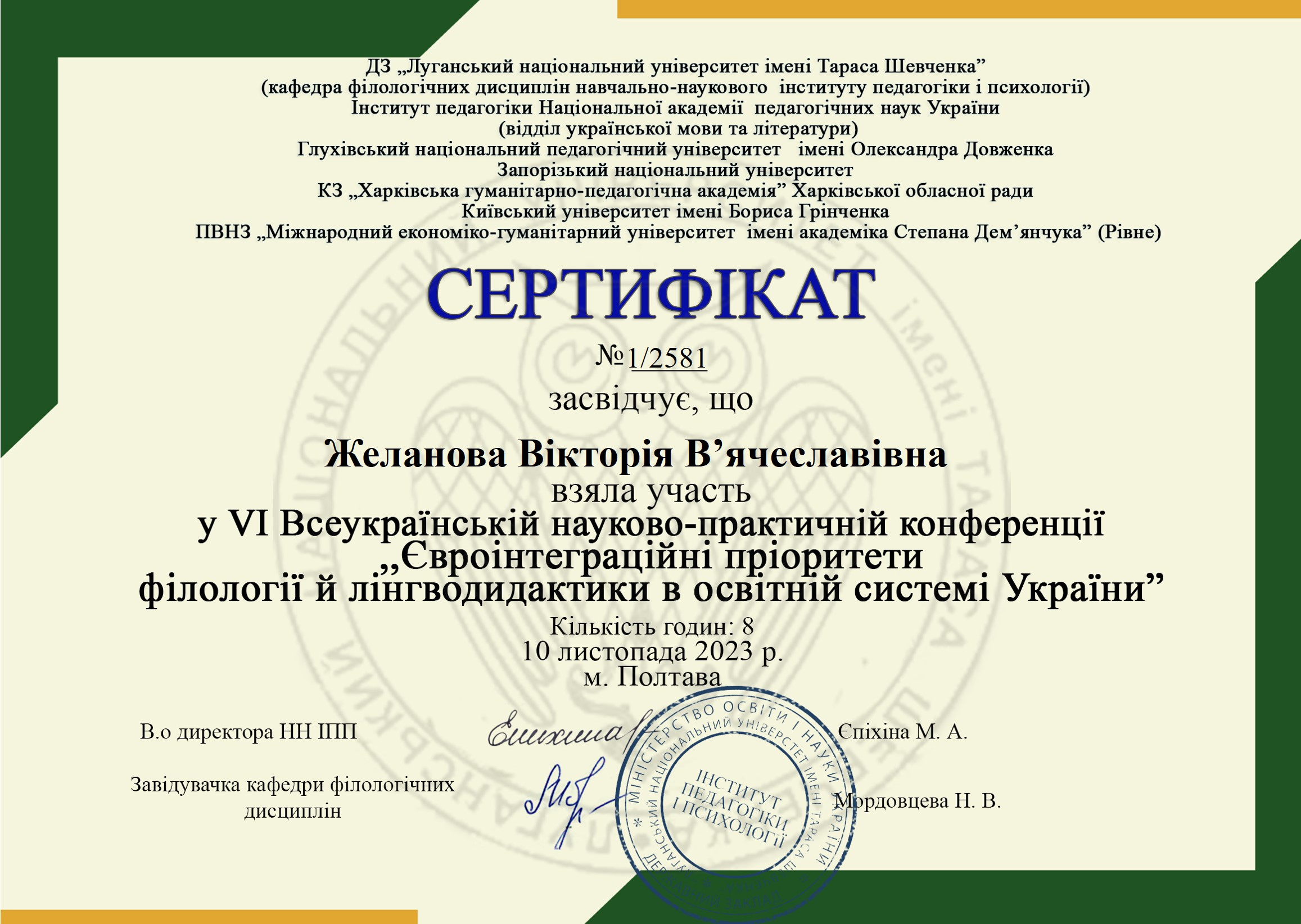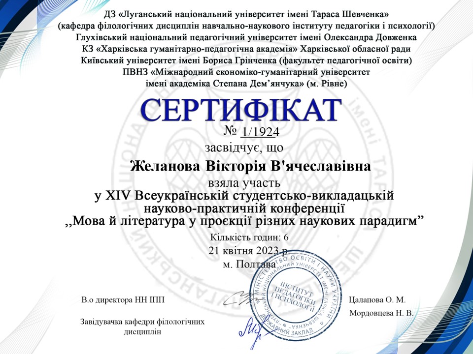 | 9811 | VІ Всеукраїнської науково-практичної конференції ,, ЄВРОІНТЕГРАЦІЙНІ ПРІОРИТЕТИ ФІЛОЛОГІЇ Й ЛІНГВОДИДАКТИКИ В ОСВІТНІЙ СИСТЕМІ УКРАЇНИ” | Мовні детермінанти інноваційної діяльності викладача сучасного університету | м. Полтава |