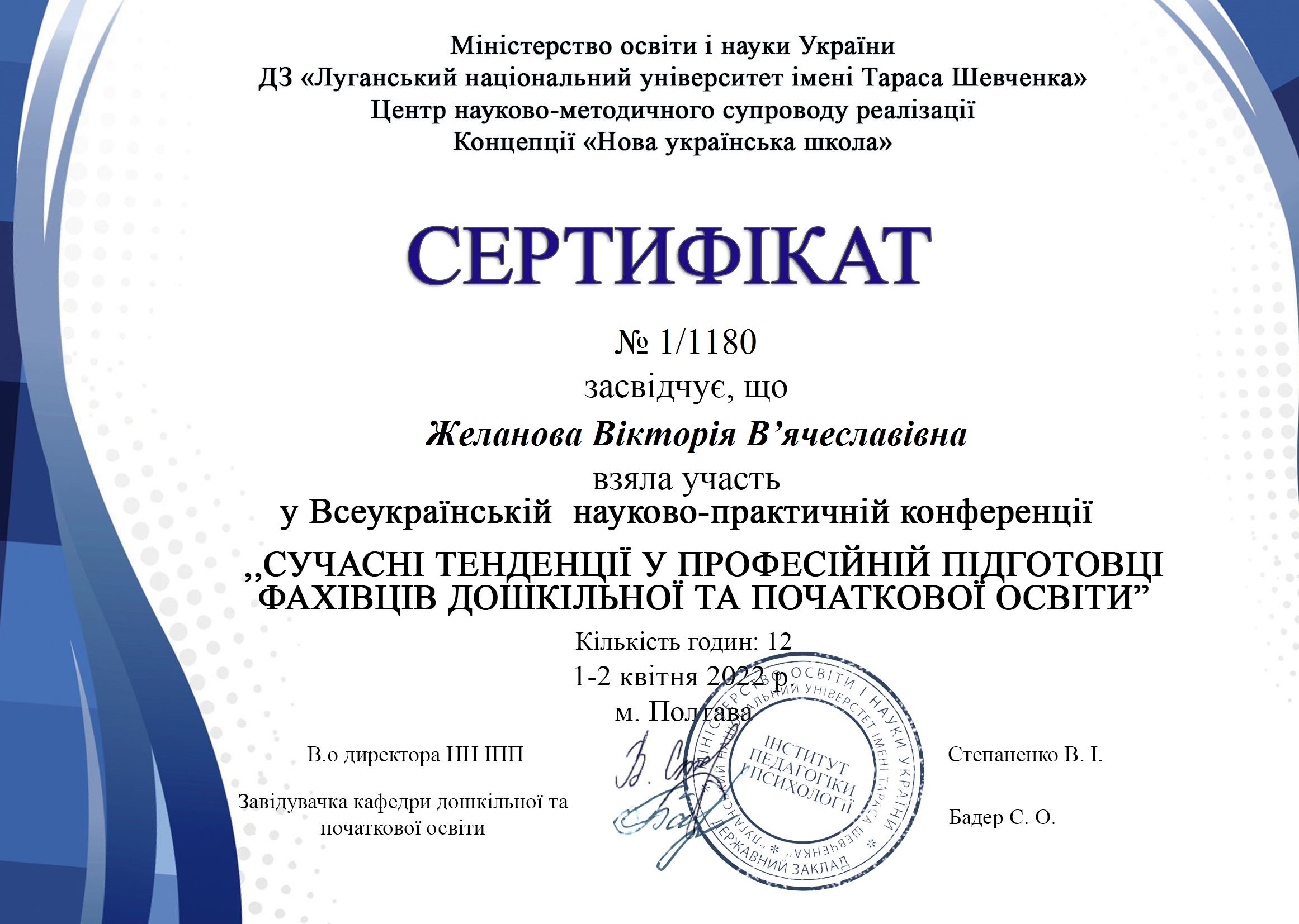 | 8265 | Всеукраїнська науково-практична конференція | "Сучасні тенденції у професійній підготовці фахівців дошкільної та початкової освіти" | м.Полтава |