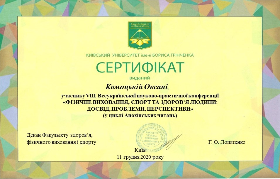 | 6411 | VIІІ Всеукраїнській науково-практичній конференції «ФІЗИЧНЕ ВИХОВАННЯ, СПОРТ ТА ЗДОРОВ’Я ЛЮДИНИ: ДОСВІД, ПРОБЛЕМИ, ПЕРСПЕКТИВИ» (у циклі Анохінських читань) | Організація освітнього процесу в умовах карантинних обмежень на Факультеті здоров’я, фізичного виховання і спорту | м.Київ |