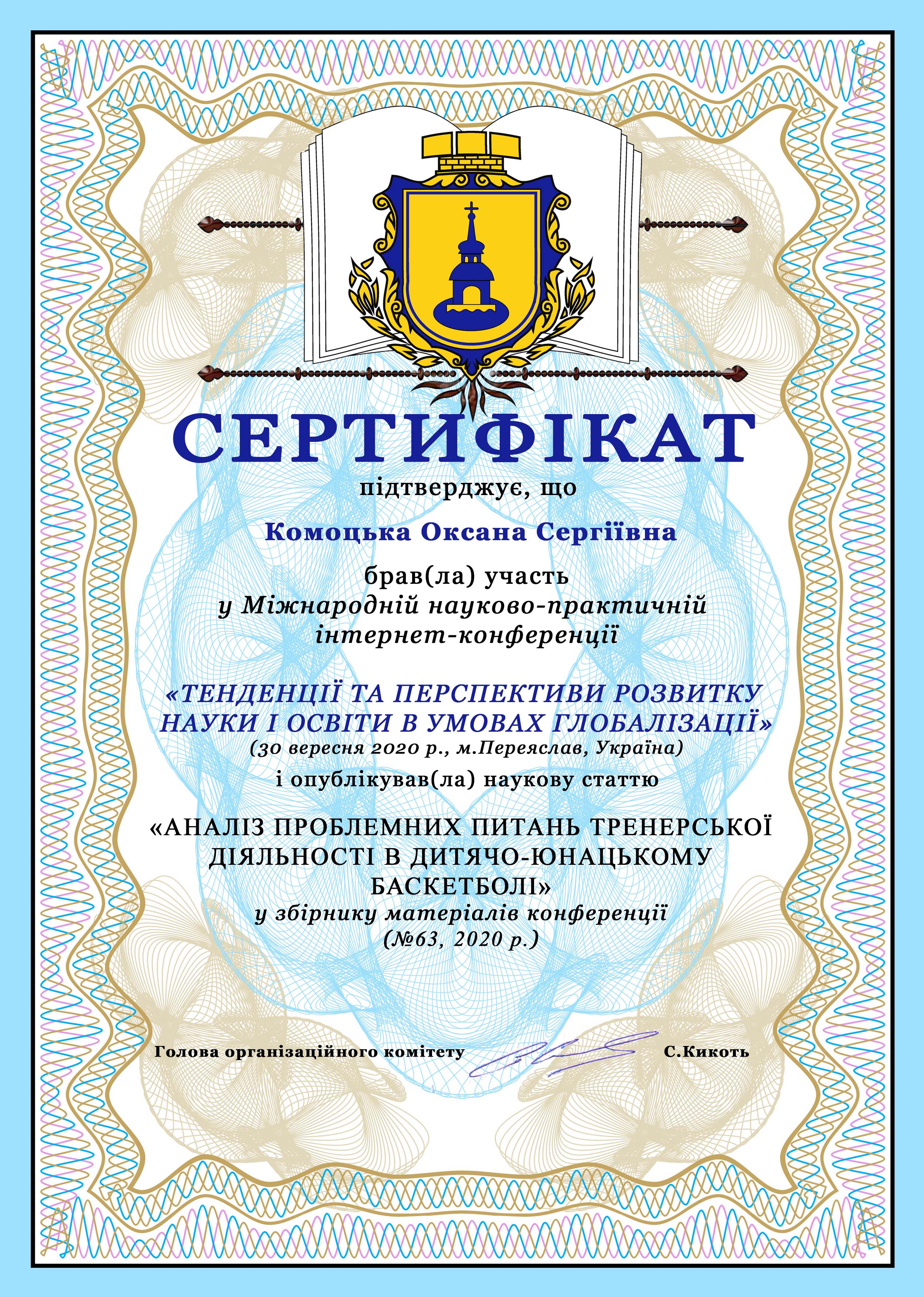 | 6412 | «Тенденції та перспективи розвитку науки і освіти в умовах глобалізації» | Аналіз проблемних питань тренерської діяльності в дитячо-юнацькому баскетболі | м. Переяслав |