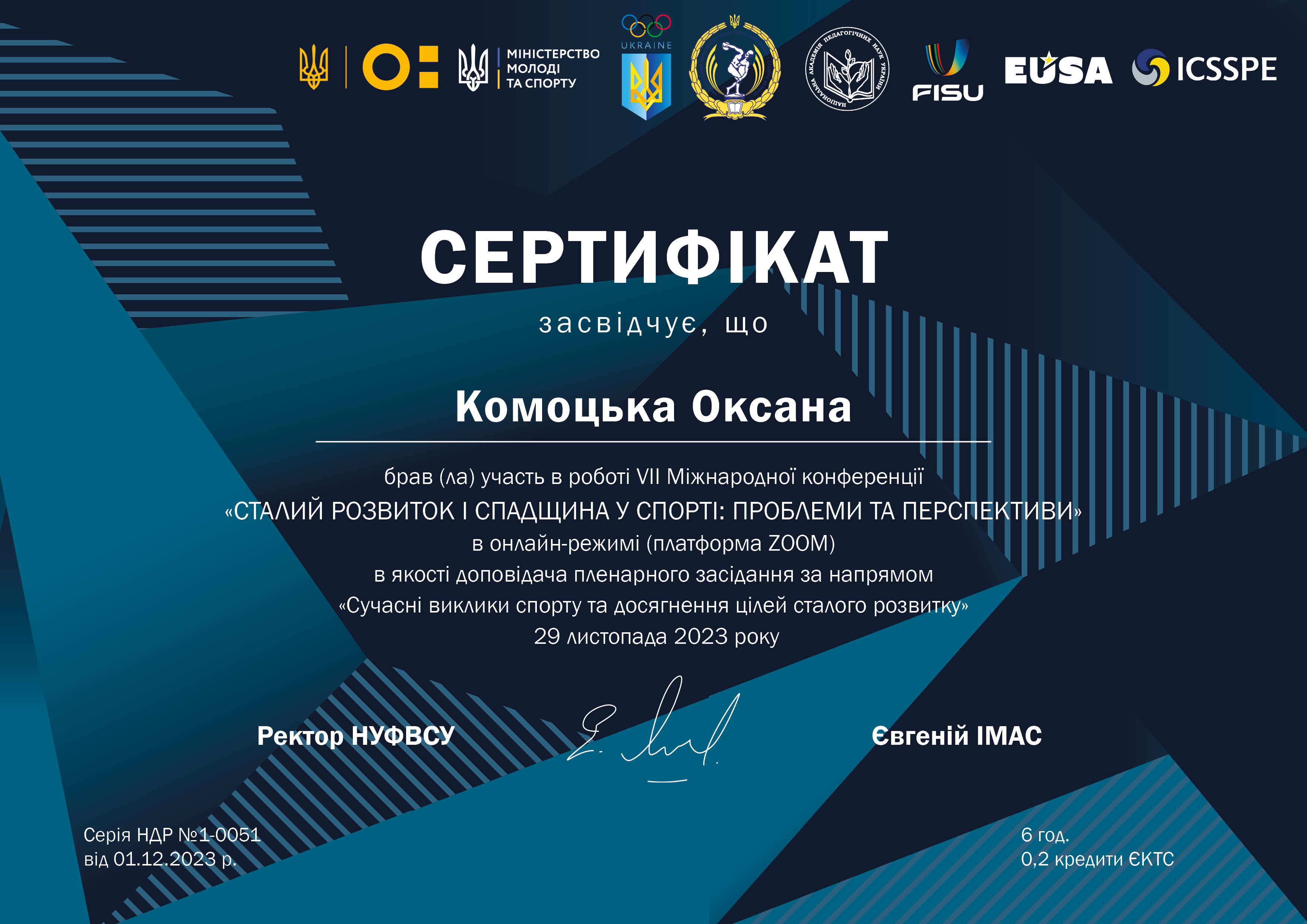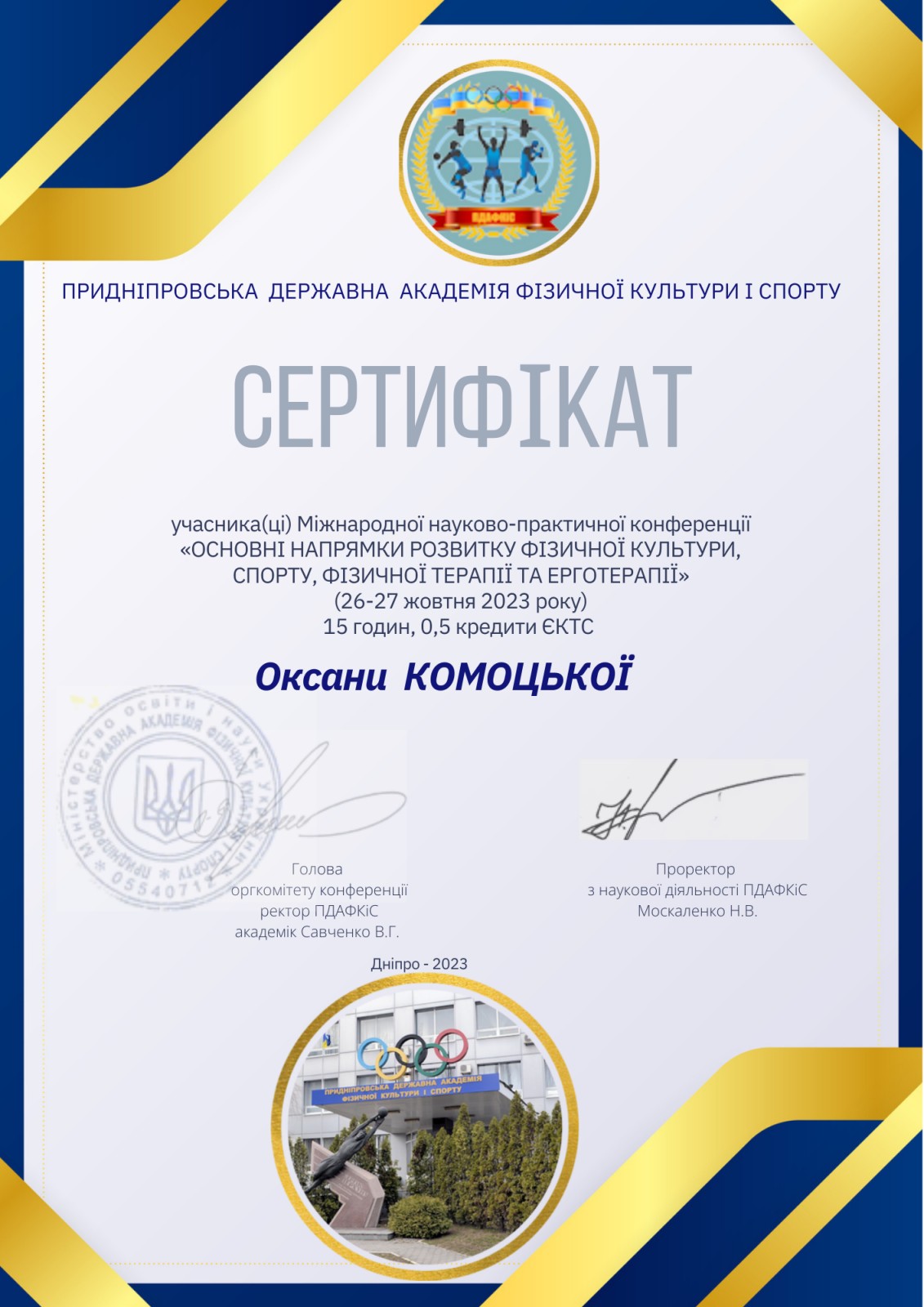 | 728 | Старший викладач | Факультет здоров'я, фізичного виховання і спорту | 2023 | 118370 | Авторське право на статтю_Komotska O., Sushko, R.. Modern approaches to the organization сhildren's and youth basketball_abroad experience. 2022. Vol. 26(4). Р.115-123.pdf |