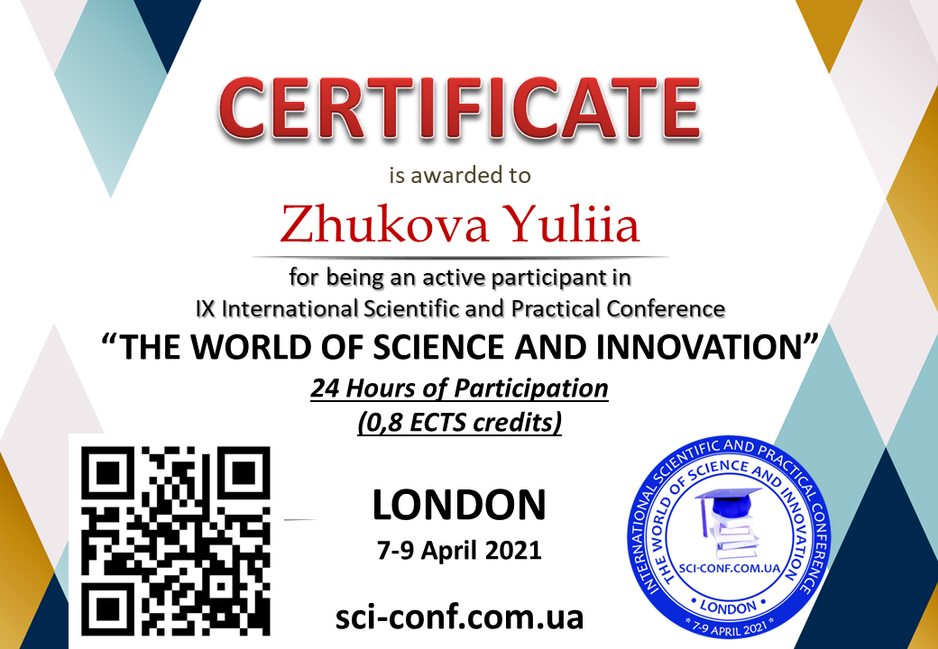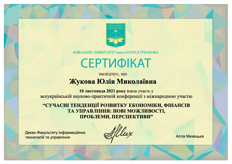 | 625 | Факультет інформаційних технологій та управління | Кафедра фінансів та економіки | 13 | 0 | 2021 | https://www.researchgate.net/profile/Ju_Zhukova |