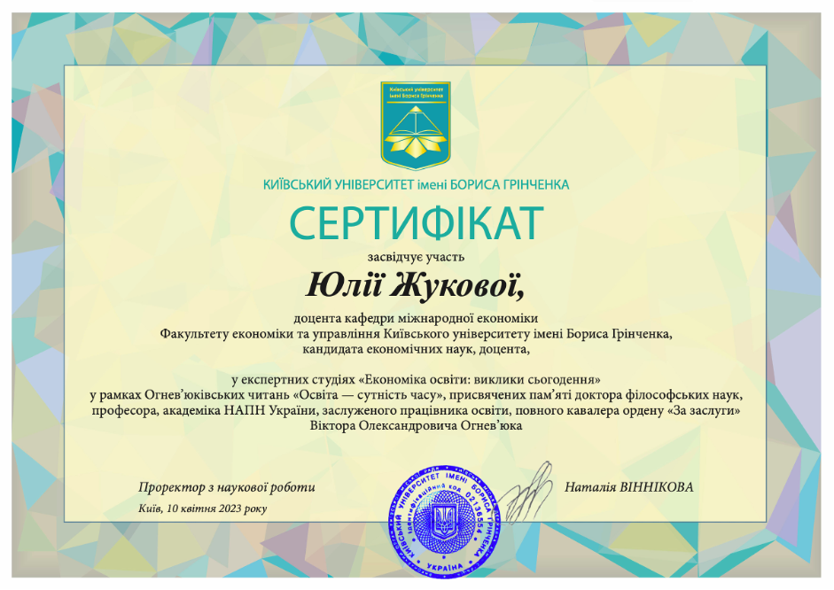 | 61 | Факультет економіки та управління | Літня | Економіка нашого міста | Київський університет імені Бориса Грінченка | Член робочої групи | 2023 | наказ_КУБГ_№315_Палац_дітей_та_юнацтва.pdf |