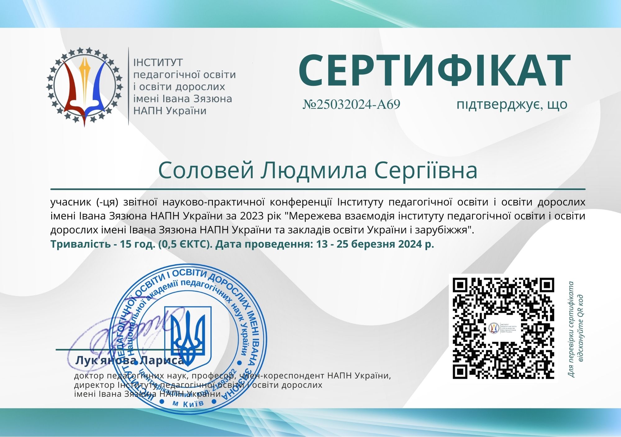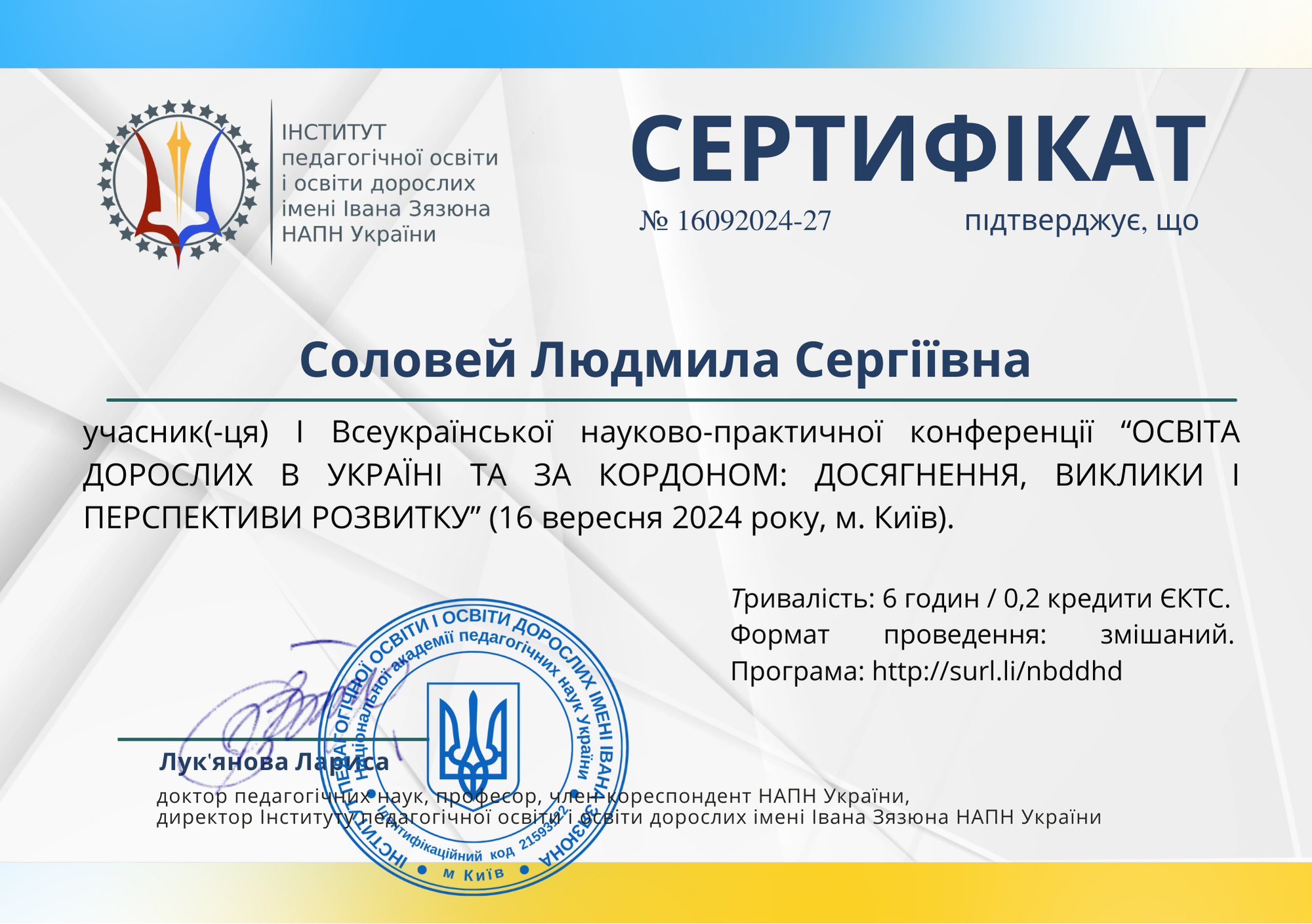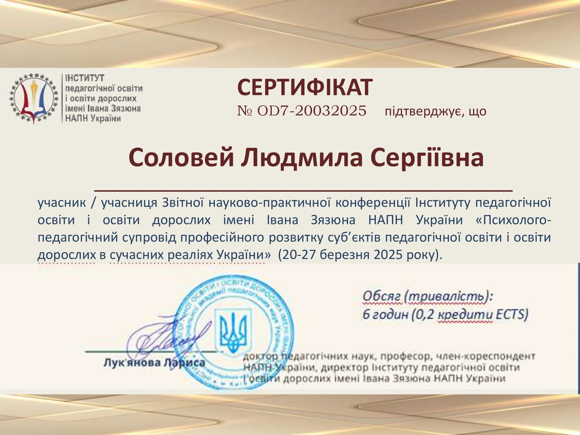 | 10695 | Освіта дорослих в Україні та за кордоном: досягнення, виклики і перспективи розвитку" | учасниця конференції | м. Київ, Інститут педагогічної освіти і освіти дорослих імені Івана Зязюна НАПН України |