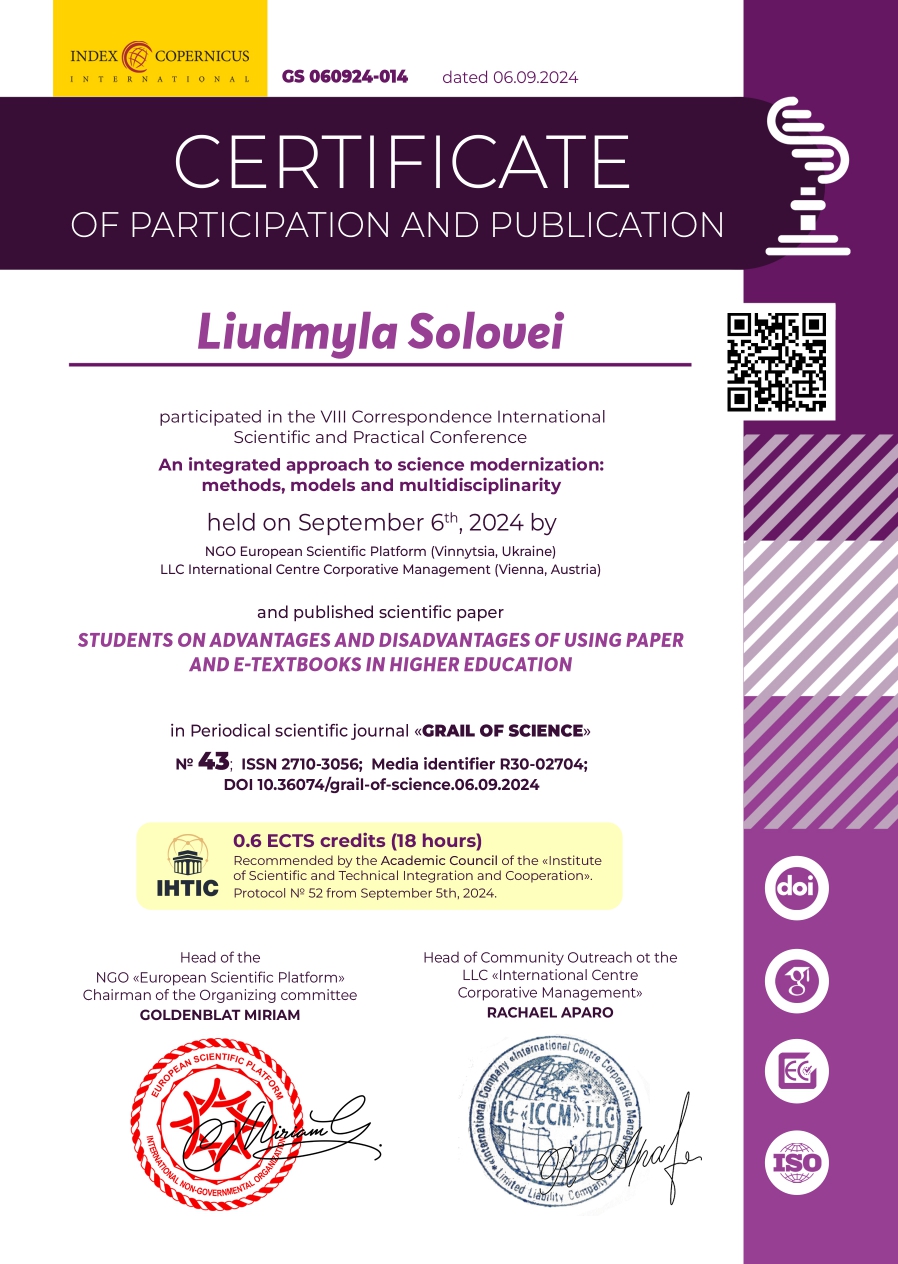 | 10686 | An integratedto science modernization: methods, models and multidisciplinarity | Students on advantages and disadvantages of using paper and e-textbooks in higher education | Correspondence conference / Vinnytsia, Ukraine - Vienna, Austria |