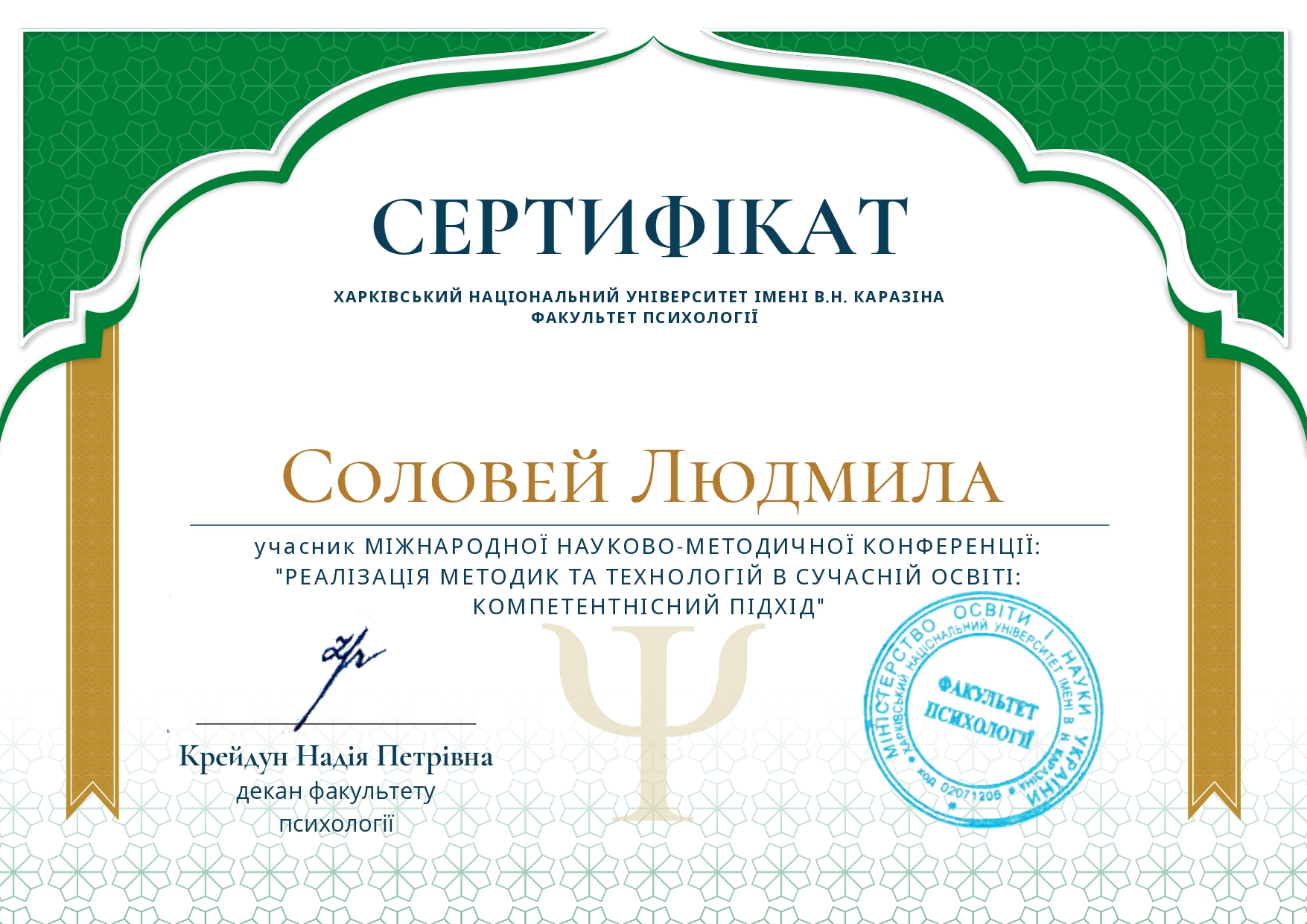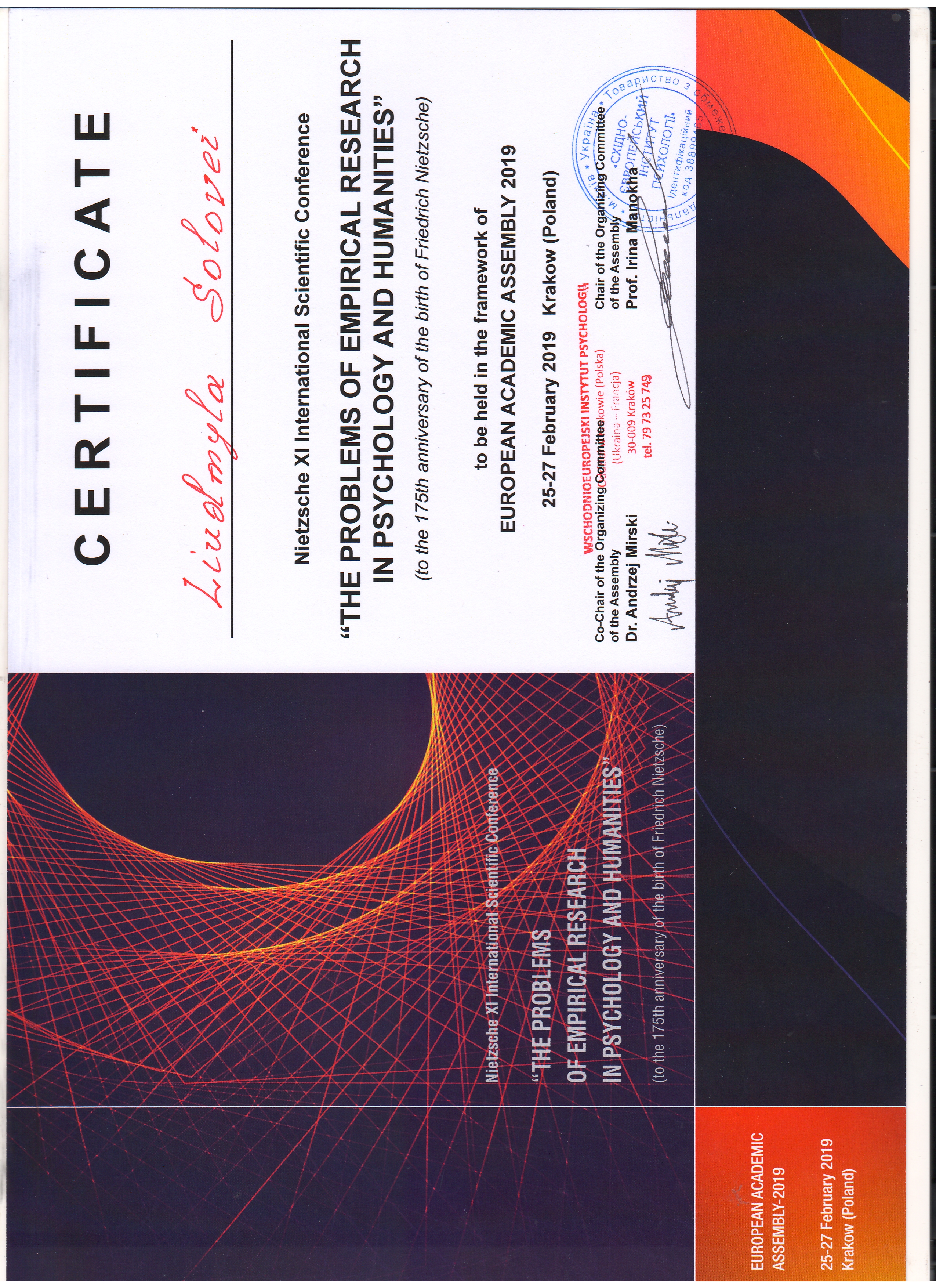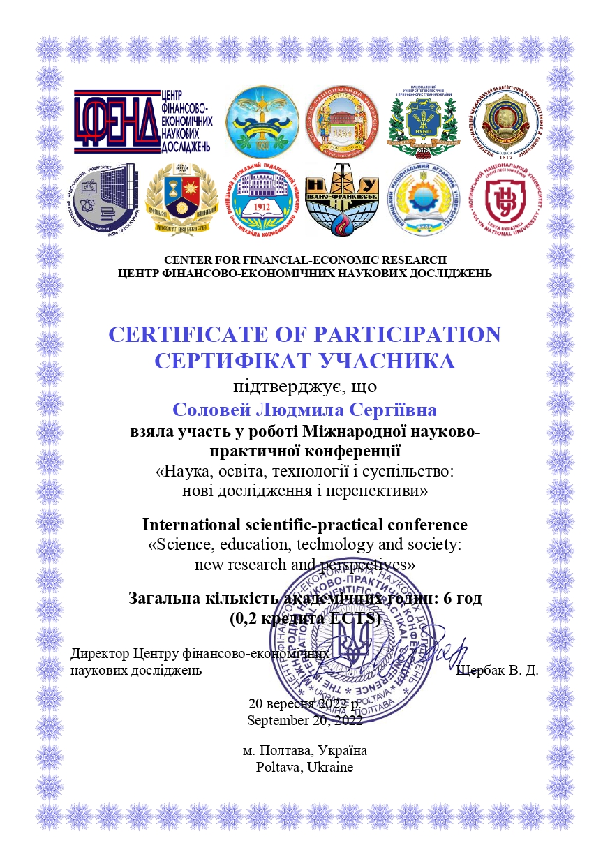 | 4016 | Friedrich Nietzsche XI International Scientific Conference " The Problems of Empirical Research in Psycology and Humanities"("Проблеми емпіричних досліджень з психології та з гуманітарних наук"). | MODELS OF ADULT EDUCATION CENTRES IN UKRAINE | м. Краків, Польща |