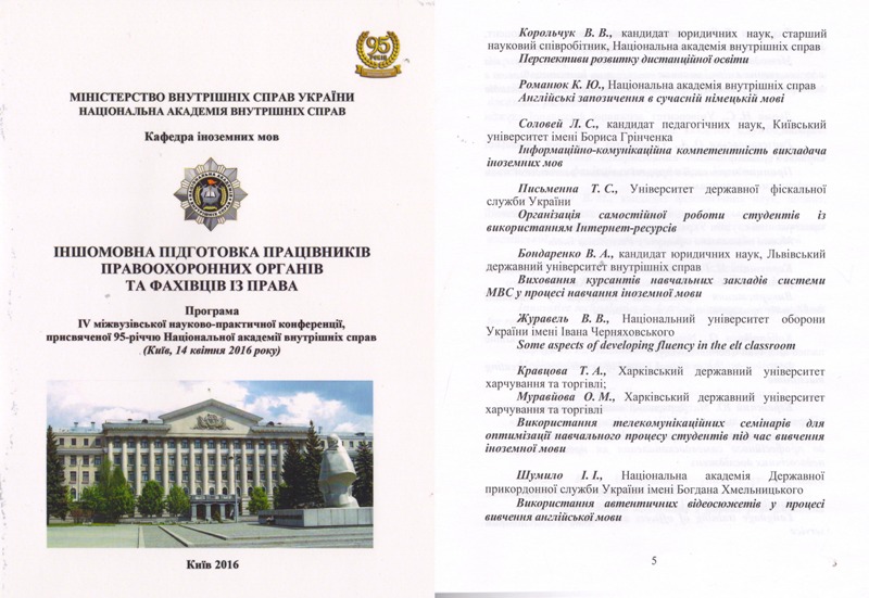 | 727 | IV міжвузівська науково-практична конференція 'Іншомовна підготовка працівників правоохоронних органів та фахівців права'. | Інформаційно-комунікаційна компетентність викладача іноземних мов | Національна академія внутрішніх справ. м. Київ |