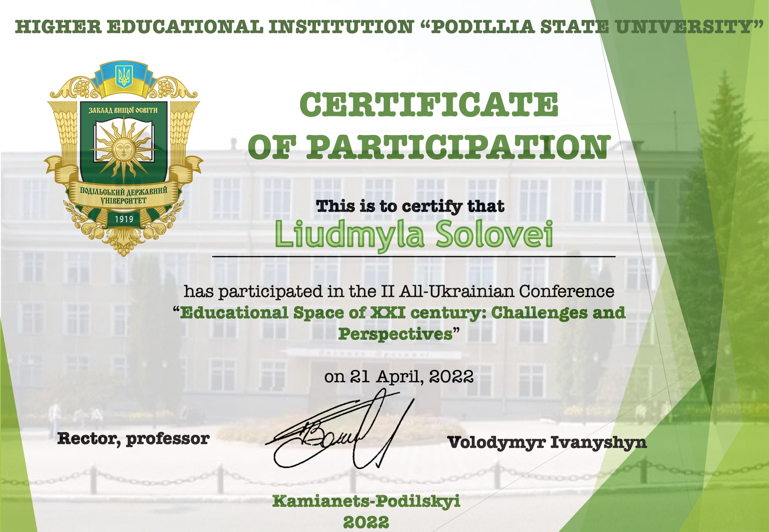 | 7969 | II All-Ukrainian conference "Educational Space of XXI century: Challenges and Perspectives" | ПРОГРЕСИВНИЙ РОЗВИТОК ВИЩОЇ ОСВІТИ У ШВЕЦІЇ В УМОВАХ ЄВРОІНТЕГРАЦІЇ: ДОСВІД ДЛЯ УКРАЇНИ | Kamianets-Podilskyi |