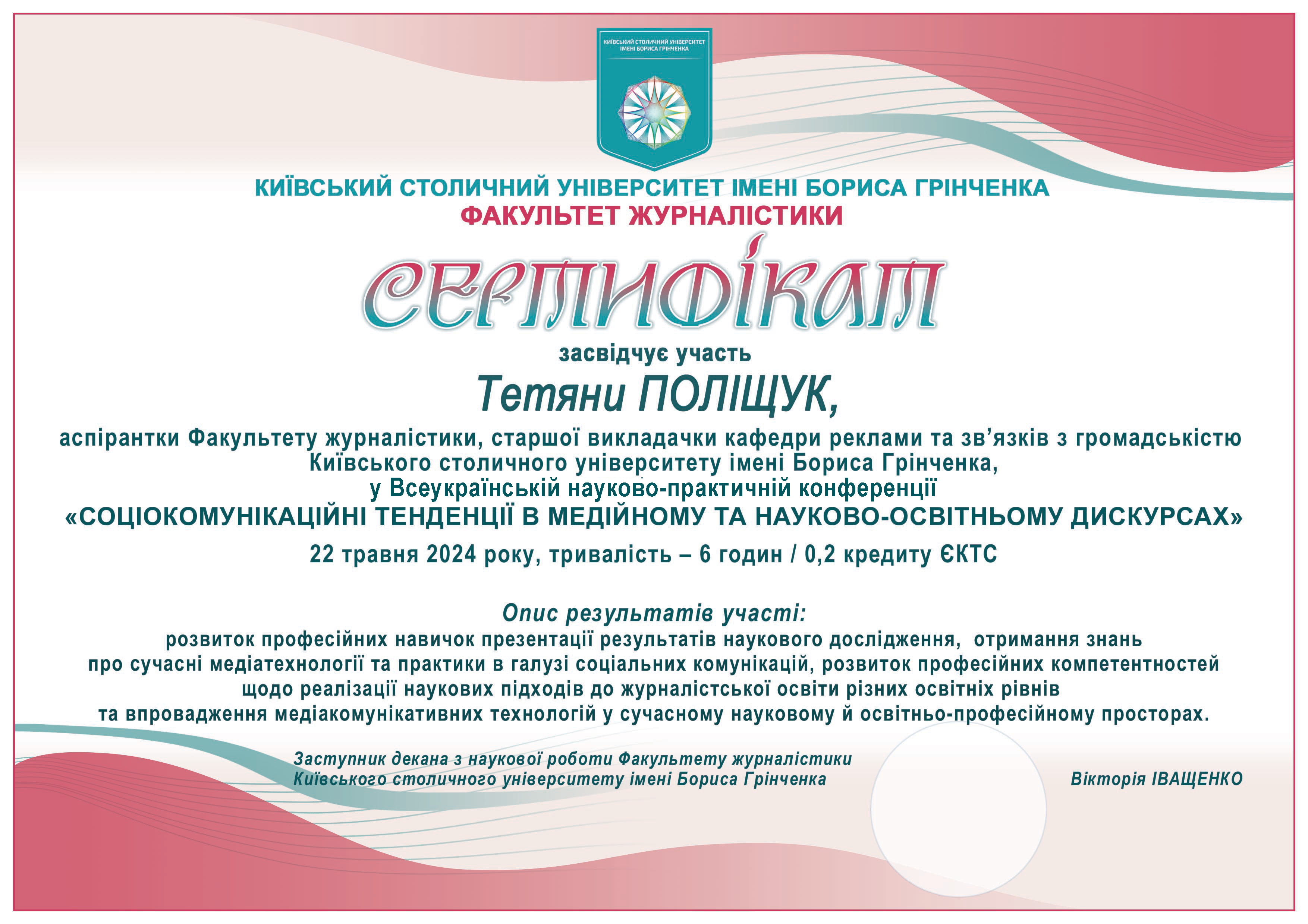 | 50 | Факультет журналістики | Кафедра реклами та зв'язків з громадськістю | Загальноуніверситетський мовно-літературний конкурс «Словник Грінченка і сучасність» | 2024 |