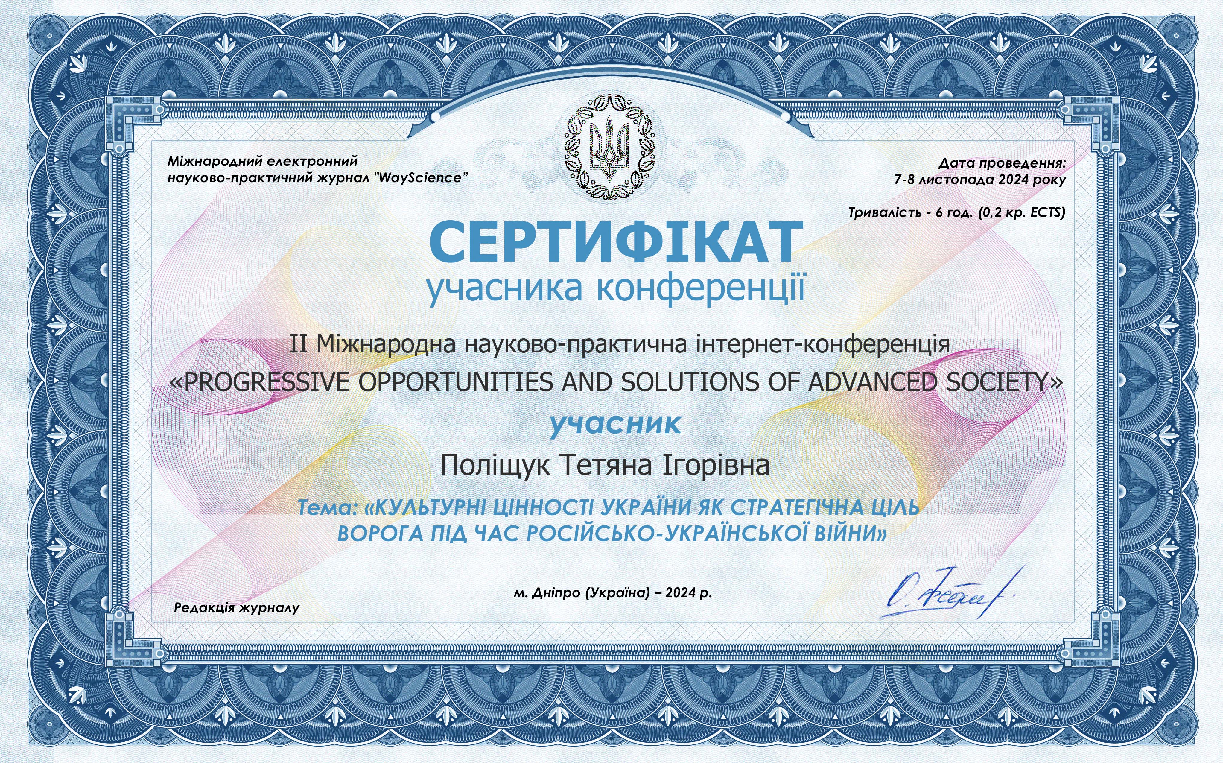 | 11219 | II Міжнародна науково-практична інтернет- конференція «Progressive Opportunities and Solutions of Advanced Society» | КУЛЬТУРНІ ЦІННОСТІ УКРАЇНИ ЯК СТРАТЕГІЧНА ЦІЛЬ ВОРОГА ПІД ЧАС РОСІЙСЬКО-УКРАЇНСЬКОЇ ВІЙНИ | Дніпро, Україна |