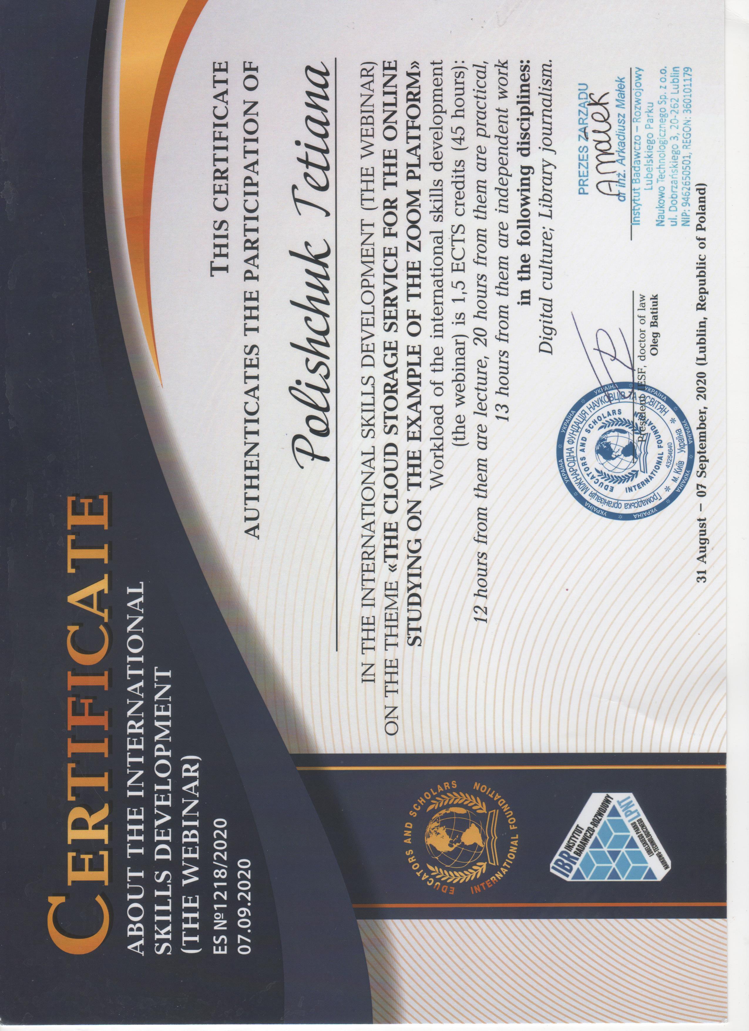 | 5853 | Вебінари від Інституту науково-дослідного Люблінського науково-технологічного парку та ГО «Міжнародна фундація науковців та освітян» | «Хмарні сервіси для онлайн-навчання на прикладі платформи Zoom» | Люблін, Польща |