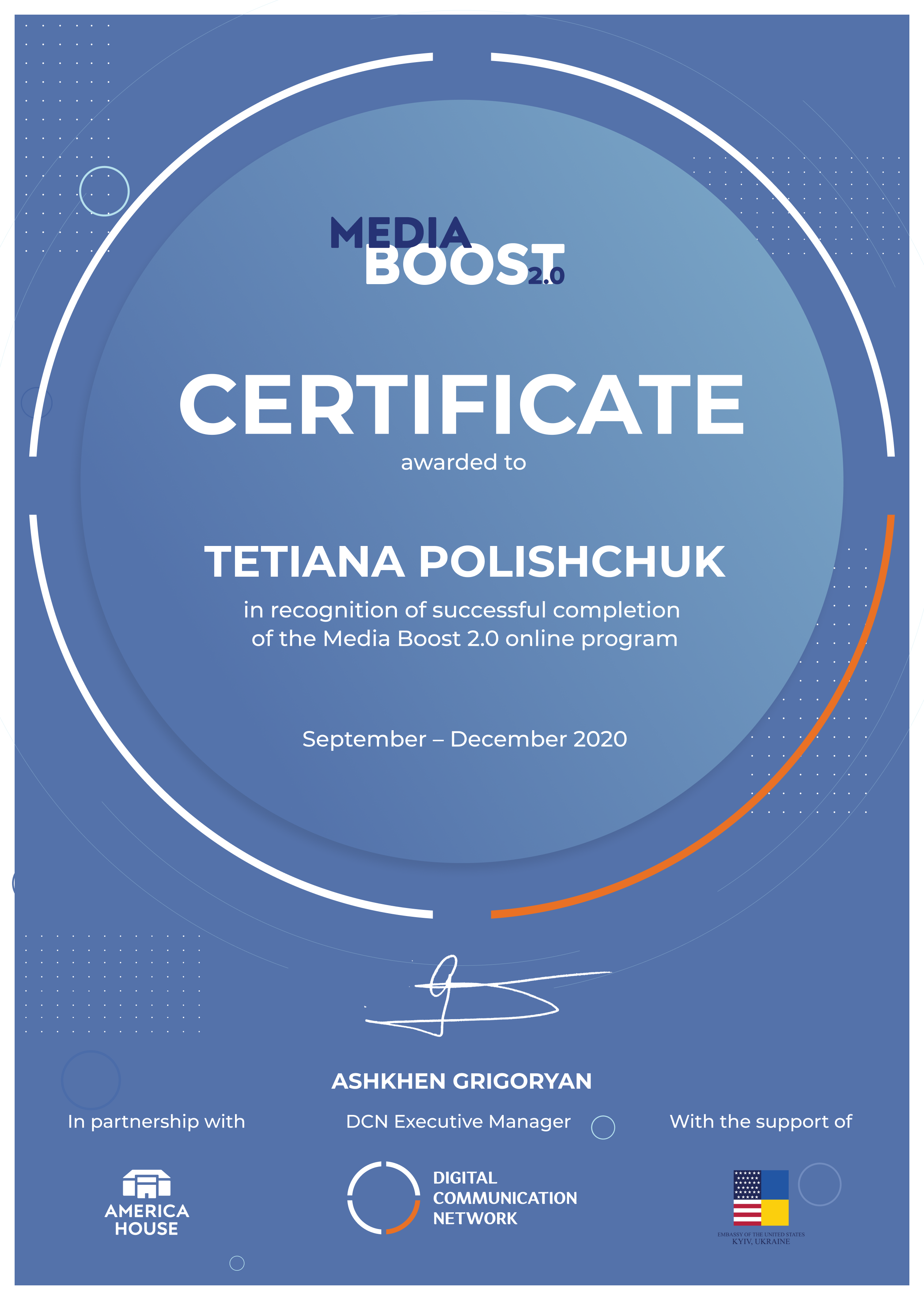 | 6267 | Media Boost 2:0 від America House Kyi, Digital Communication Network за підтримки Державного департаменту США | Інтенсив для інфлюенсерів: сторітелінг, монетизація та розумні додатки. | США, Україна |