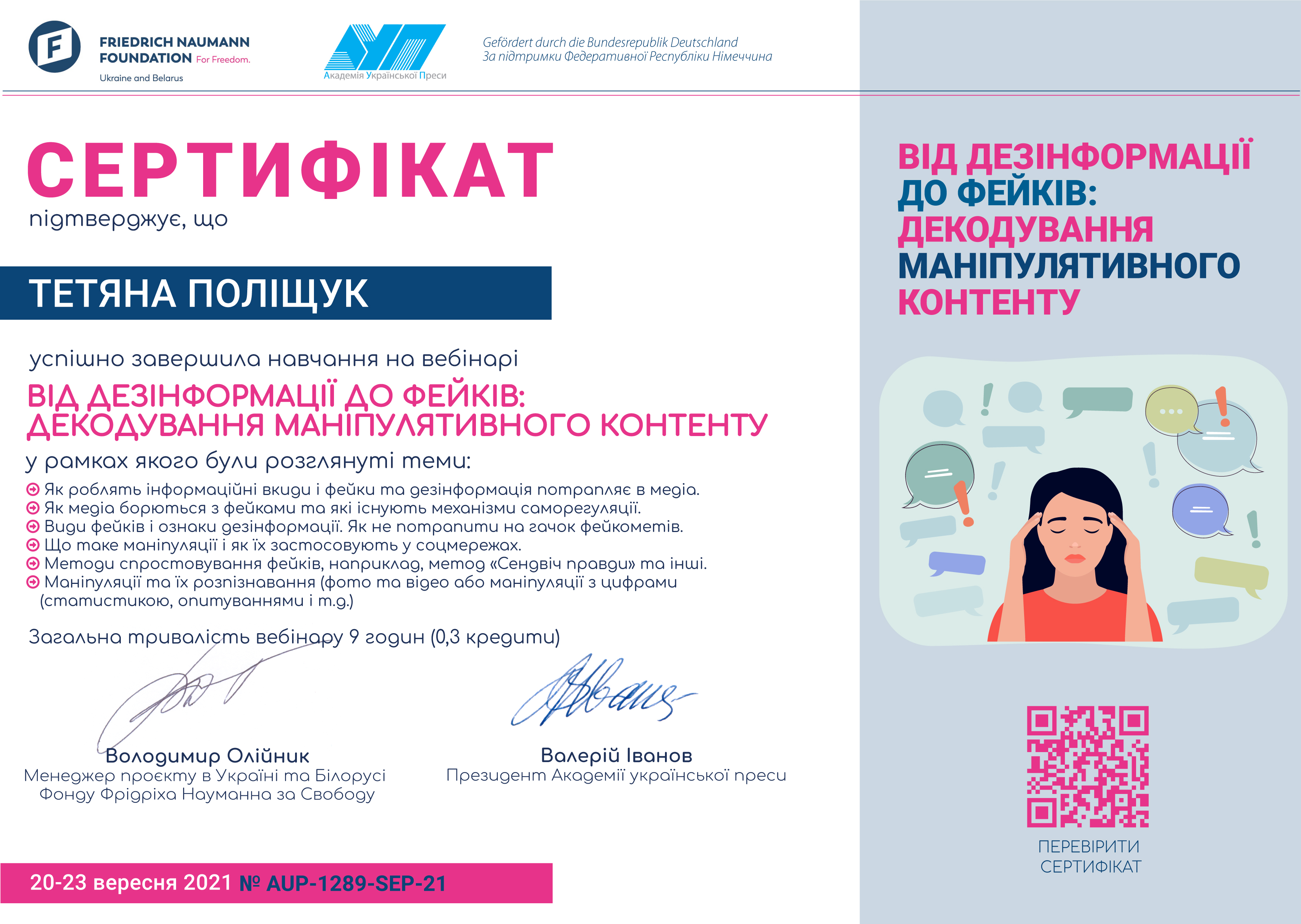 | 7468 | Вебінар «Від дезінформації до фейків: декодування маніпулятивного контенту» | Маніпуляції та їх розпізнавання в соціальних мережах | Німеччина, Україна |