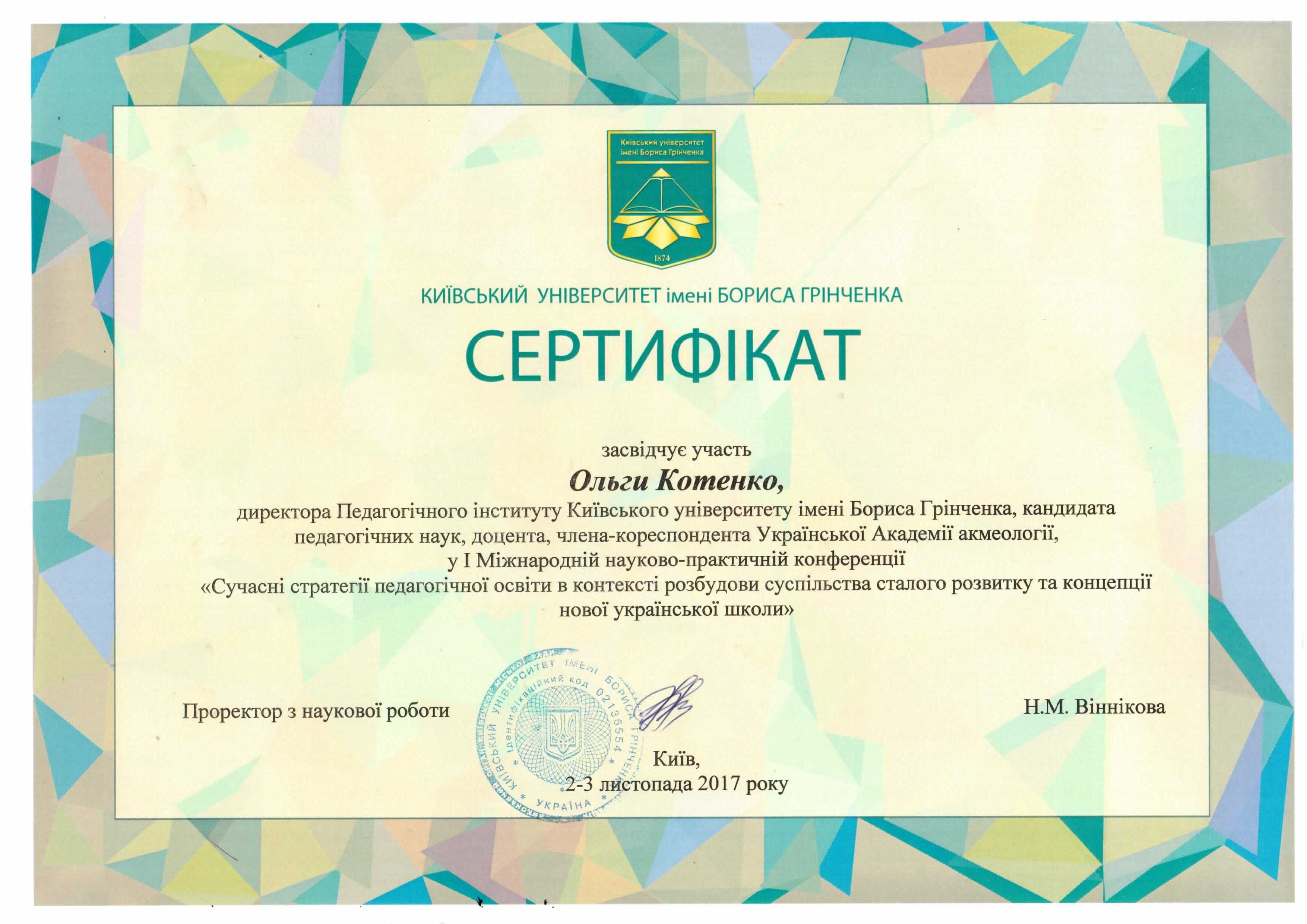 | 1242 | «Сучасні стратегії педагогічної освіти в контексті розбудови суспільства сталого розвитку та концепції Нової української школи | Міжнародна науково-практична конференція | Київський університет імені Бориса Грінченка | 02.11.2017 00:00 | 10 |