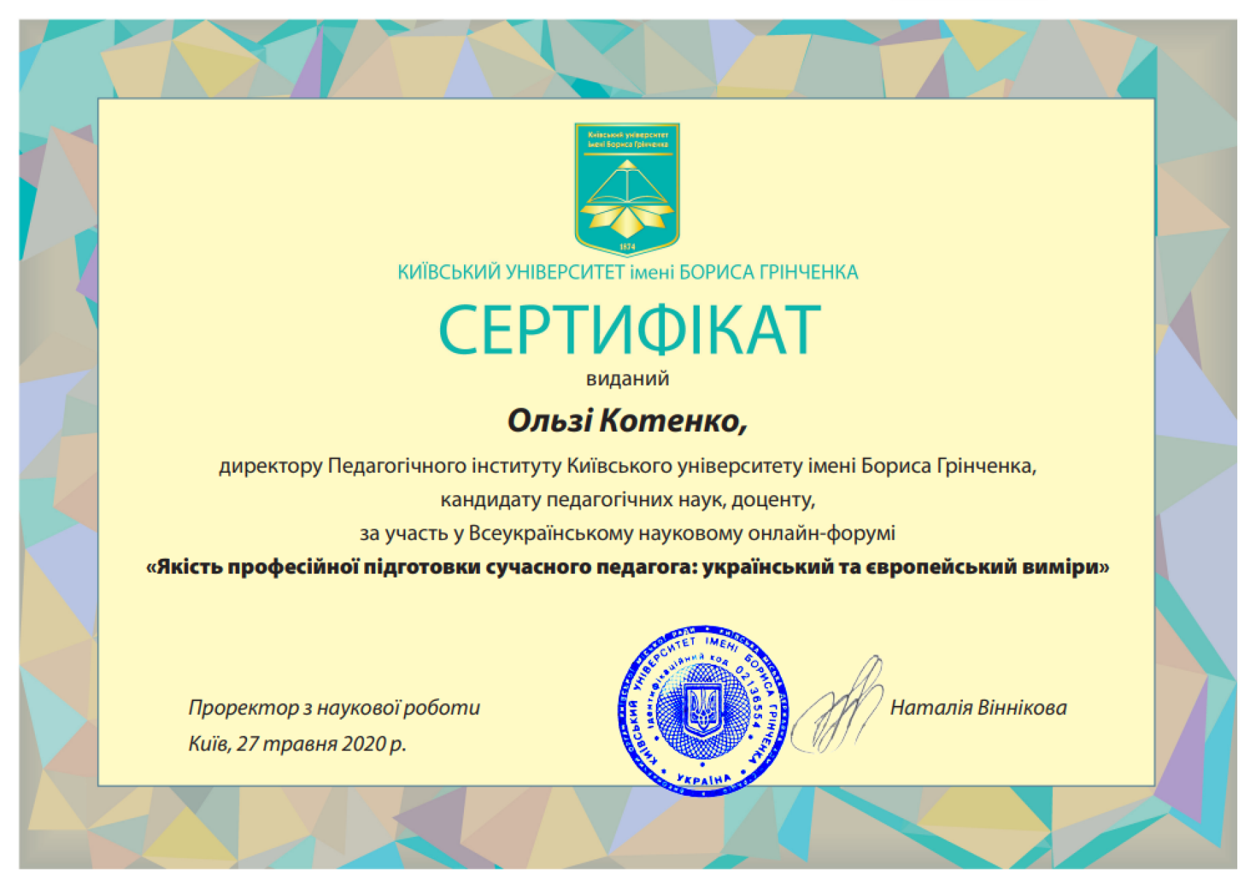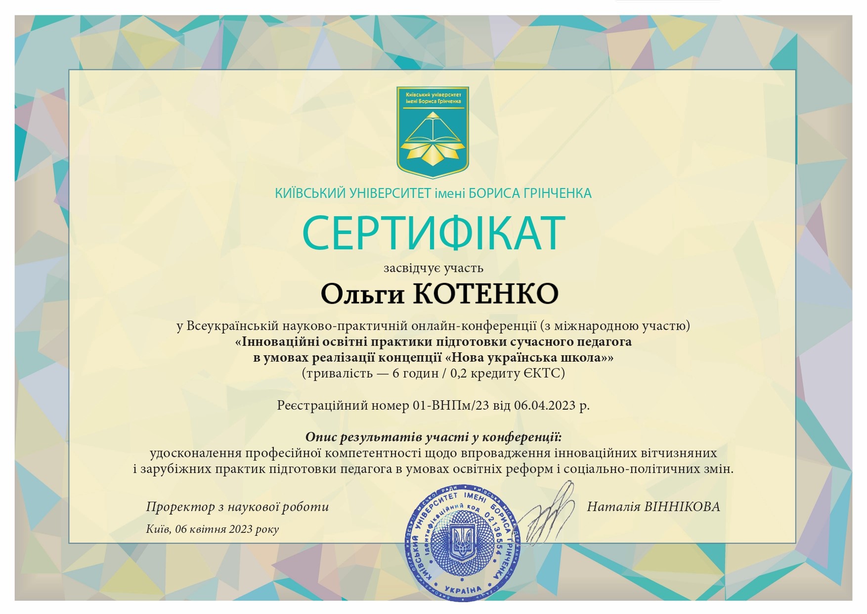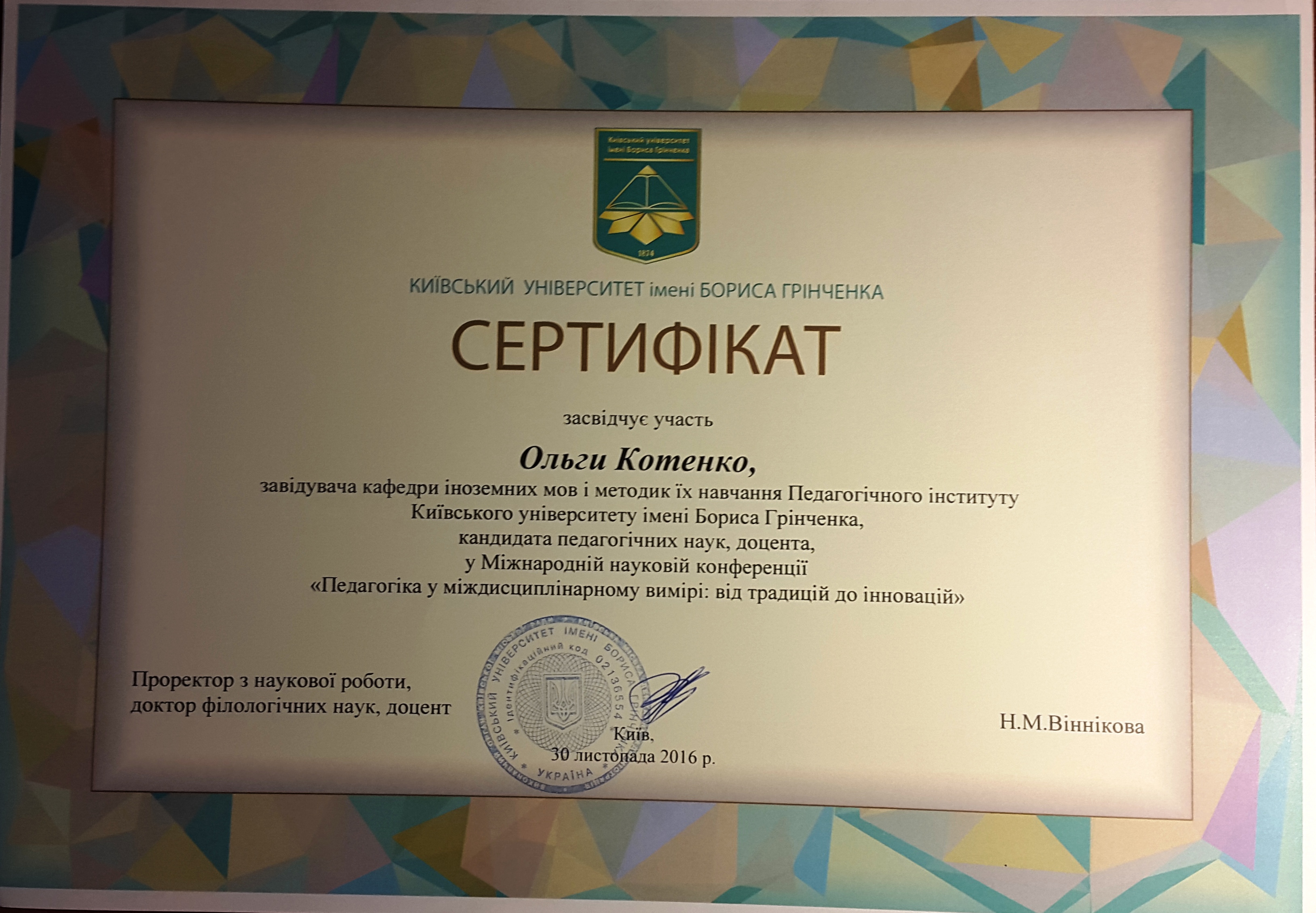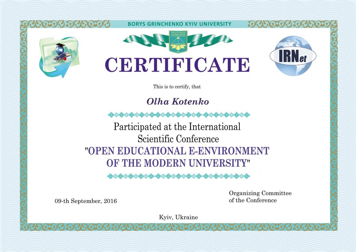 | 1254 | "Професійна підготовка педагогів в умовах євроінтеграції: проблеми та перспективи" | Всеукраїнська науково-практична конференція | Київський університет імені Бориса Грінченка | 12.10.2017 00:00 | 5 |